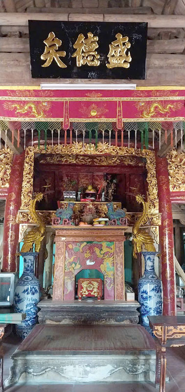 + Ngai thờ: Cao 1,65m ; dài 0,70m ; rộng 0,60m. Cỗ ngai được tạo dáng đẹp, sơn son thếp vàng lộng lẫy. Tay ngai là 2 hình rồng ngẩng cao đầu, miệng há ngậm ngọc, bởm tóc cong đều bay tỏa ra phía sau. Xung quanh có 6 cột tiện thắt cổ bồng, hình tròn đồng tâm. 6 cột chạm nối hình rồng cuốn quanh cột, đầu rồng dục nổi hẳn ra ngoài . Đế ngai được trang trí theo từng băng ô chạy ngang, chạm nối, đục thủng những hình hổ phù càm chữ Thọ, hình phượng, cánh sen, hình cánh sen dẹo, hoa cúc, hình lân.... Trong ngai đặt mục dục không ghi mỹ hiệu vị thần. Ngai có mũ, cánh chuồn trang trí đẹp ( Nghệ thuật thời Nguyễn, đầu thế kỷ 20)