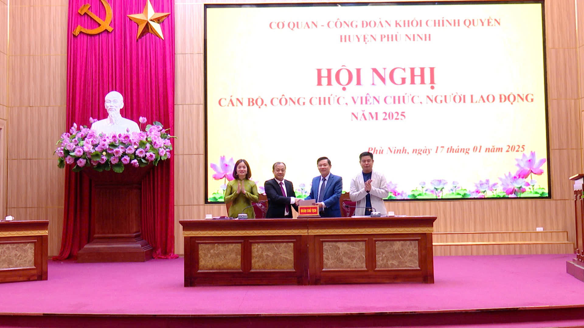(Phù Ninh)- Chiều ngày 17/1/2025, cơ quan Khối Chính quyền huyện Phù Ninh tổ chức hội nghị cán bộ, công chức, viên chức người lao động (CBCCVCNLĐ) năm 2025. Dự hội nghị có đồng chí Nguyễn Hữu Nhật – Phó Bí thư Huyện uỷ, Chủ tịch UBND huyện, đồng chí Ngô Quang Chính - Uỷ viên BTV Huyện uỷ, Phó Chủ tịch HĐND huyện. Đồng chí Trịnh Đức Lai – Uỷ viên BTV Huyện uỷ, Phó Chủ tịch UBND huyện, Thủ trưởng cơ quan Khối Chính quyền huyện; đồng chí Nguyễn Long Giang - Ủy viên BTV Huyện ủy, Phó Chủ tịch UBND huyện; đại biểu Liên đoàn lao động huyện cùng toàn thể CBCCVCNLĐ cơ quan UBND huyện.