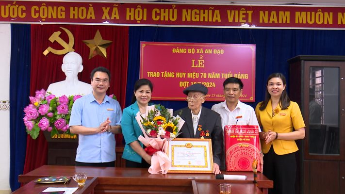 Đồng chí Nguyễn Thị Tố Uyên- Tinh ủy viên, Bí thư Huyện ủy, Chủ tịch HĐND huyện Trao Huy hiệu 70 năm tuổi Đảng và tặng hoa chúc mừng đảng viên Ngô Ngọc Liễu, sinh hoạt tại Chi bộ 9, Đảng bộ xã An Đạo