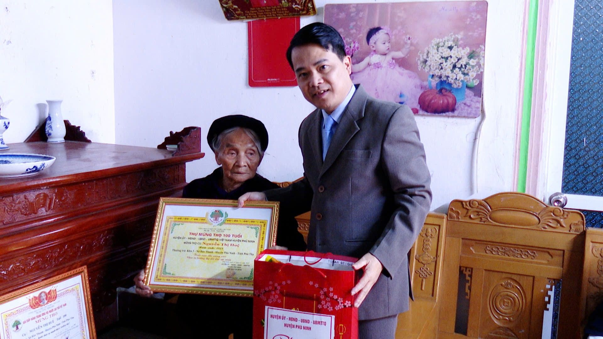 Đến thăm gia đình các Cụ 100 tuổi, đồng chí Phó Chủ tịch HĐND huyện đã ân cần thăm hỏi tình hình sức khỏe, điều kiện sinh hoạt, tinh thần của các Cụ và chúc các Cụ luôn dồi dào sức khỏe, là chỗ dựa vững chắc cho con cháu, là tấm gương sáng, trung tâm đoàn kết cháu con trong gia đình, dòng họ và làng xóm. Đồng chí cũng đề nghị cấp uỷ đảng, chính quyền địa phương tiếp tục quan tâm, chăm sóc cả về vật chất và tinh thần cho người cao tuổi trên địa bàn. Đoàn đã trao Thư chúc thọ; Quà của Chủ tịch nước gồm 700.000 đồng tiền mặt và 5m vải lụa trị giá 350.000 đồng; Quà của huyện Phù Ninh gồm thư chúc thọ, 01 suất quà trị giá 300.000 đồng và 500.000 đồng tiền mặt cùng quà của địa phương, Hội Người cao tuổi xã. Đại diện gia đình các cụ được chúc thọ, mừng thọ dịp này đã bày tỏ sự xúc động, phấn khởi, cảm ơn sự quan tâm sâu sắc của Đảng, nhà nước, chính quyền đối với người cao tuổi, giúp các cụ có thêm động lực, sống vui, sống khỏe cùng con cháu, gia đình và xã hội. Đây cũng chính là hoạt động thể hiện sự quan tâm của Đảng và Nhà nước ta đối với người cao tuổi, thể hiện đạo lý “uống nước nhớ nguồn” đã góp phần nâng cao nhận thức của xã hội về người cao tuổi. Đồng thời nâng cao trách nhiệm của các cấp, các ngành và toàn xã hội trong việc quan tâm, chăm lo và tạo điều kiện nhằm khích lệ Người cao tuổi tiếp tục có những cống hiến tích cực và thực sự là “Cây cao bóng cả” trong gia đình cũng như xã hội.