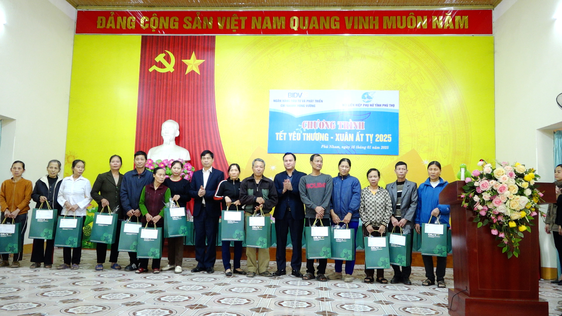 Với chủ đề “ Tết yêu thương” Ngân hàng đầu tư và phát triển chi nhánh Hùng Vương đã ủng hộ và trao tặng 60 xuất quà, mỗi suất 500.000đ tổng trị giá 30 triệu đồng cho các hộ hội viên phụ nữ có hoàn cảnh khó khăn do ảnh hưởng bởi thiên tai trên địa bàn xã Gia Thanh và xã Phú Nham. Các phần quà là tình cảm, sự sẻ chia của tập thể cán bộ Ngân hàng đầu tư và phát triển chi nhánh Hùng Vương dành tặng những gia đình hội viên phụ nữ có hoàn cảnh khó khăn, tiếp thêm động lực để họ vượt khó vươn lên, đón xuân mới Ất Tỵ đầy đủ, đầm ấm hơn.