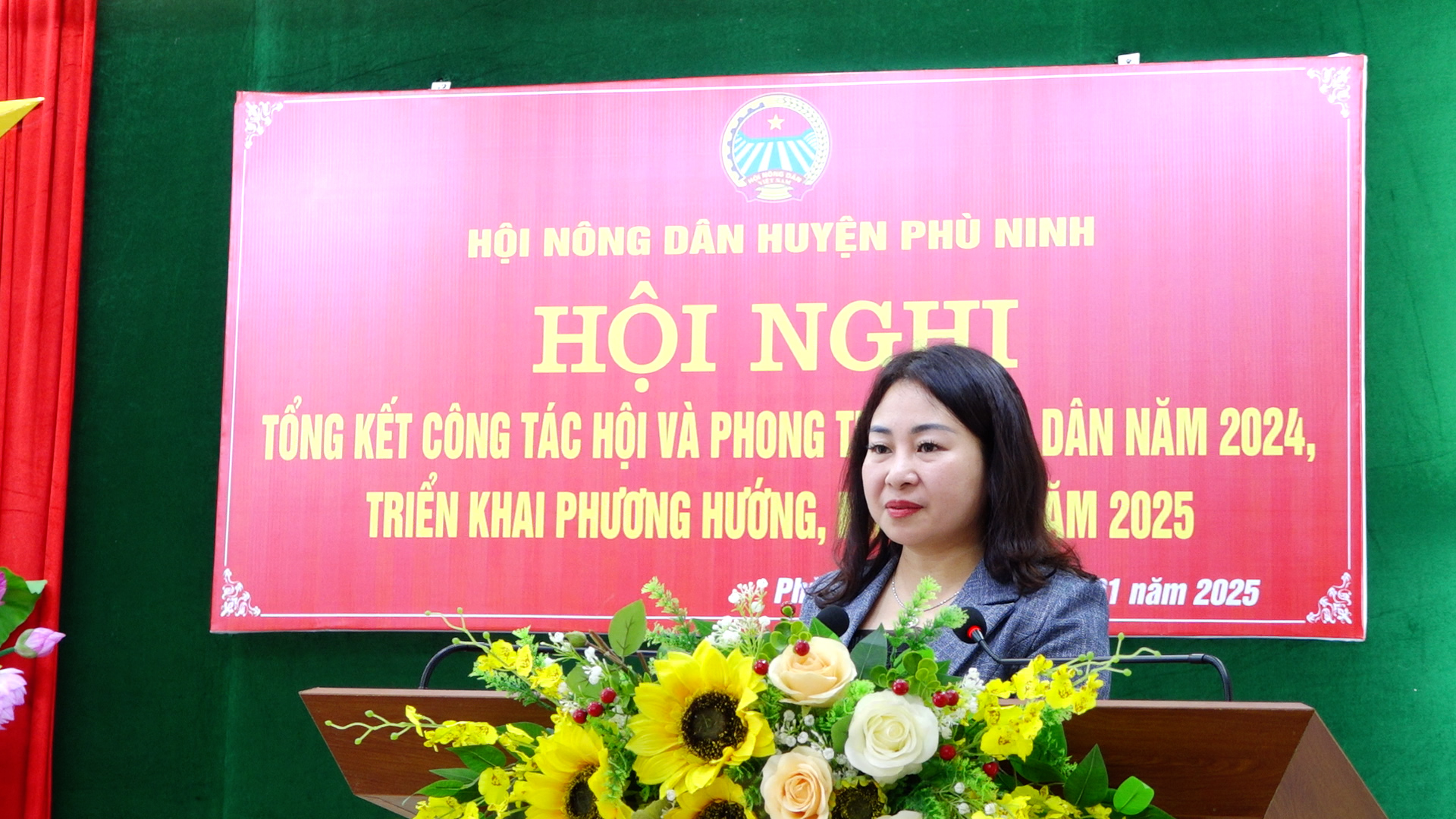 Phát biểu chỉ đạo tại hội nghị, đồng chí Phùng Thị Hồng Chuyên – Phó Chủ tịch Hội Nông dân tỉnh biểu dương và chúc mừng những kết quả của các cấp hội trong huyện Phù Ninh đạt được trong năm 2024 như tham gia các phong trào cải tạo xoá vườn tạm, giải phóng mặt bằng tại các dự án trọng điểm của tỉnh, huyện…. Các chỉ tiêu tỉnh giao cho đều đạt và vượt. Là đơn vị dẫn đầu trong kích hoạt và sử dụng nền tảng số “Nông dân Việt Nam”. Đồng chí lưu ý thêm: Năm 2025 là năm tổ chức Đại hội Đảng bộ các cấp nhiệm kỳ 2025 – 2030, tiến tới Đại hội Đảng toàn quốc lần thứ XIV của Đảng. Để thực hiện thắng lợi các mục tiêu Nghị quyết Đại hội đại biểu Đảng bộ huyện lần thứ XIX, nhiệm kỳ 2020-2025 đã đề ra. Do vậy, các cấp hội nông dân trong huyện cần tiếp tục đẩy mạnh công tác tuyên truyền, giáo dục chính trị, tư tưởng đổi mới phương thức, nội dung hoạt động phù hợp, hiệu quả; đội ngũ cán bộ hội cần nêu cao tinh thần trách nhiệm, nâng cao trình độ, bản lĩnh chính trị, gương mẫu đi đầu trong thực hiện nhiệm vụ. Tập trung vận động, tuyên truyền hội viên phát huy vai trò chủ thể của mình, tích cực tham gia các phong trào thi đua yêu nước gắn với xây dựng NTM. Đẩy mạnh phong trào nông dân thi đua sản xuất, kinh doanh giỏi, đoàn kết giúp nhau làm giàu và giảm nghèo bền vững. Đổi mới và nâng cao các hoạt động tư vấn, hỗ trợ, dịch vụ, đào tạo nghề cho lao động nông thôn phát triển sản xuất, kinh doanh.