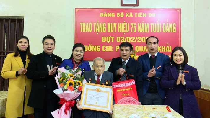 Đồng chí Nguyễn Thị Tố Uyên- TUV, Bí thư Huyện ủy, chủ tịch HĐND huyện trao Huy hiệu75 tuổi đảng cho đồng chí Phạm Quang Khải- Đảng bộ xã Tiên Du.