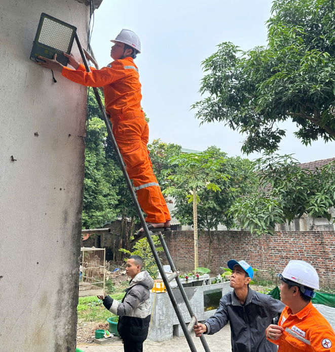 Nhân viên Điện lực hỗ trợ lắp bóng đèn năng lượng mặt trời miễn phí cho khách hàng có hoàn cảnh khó khăn tại xã Bình Phú, huyện Phù Ninh.