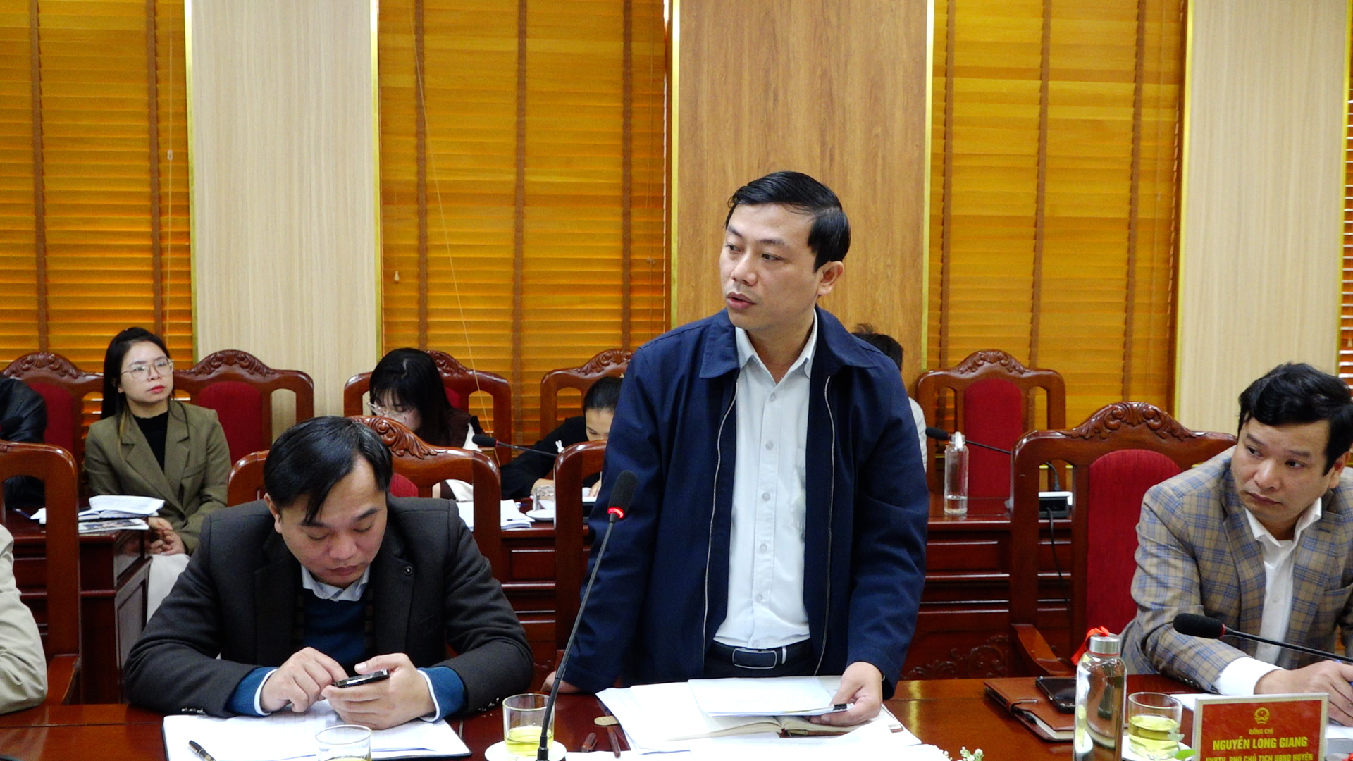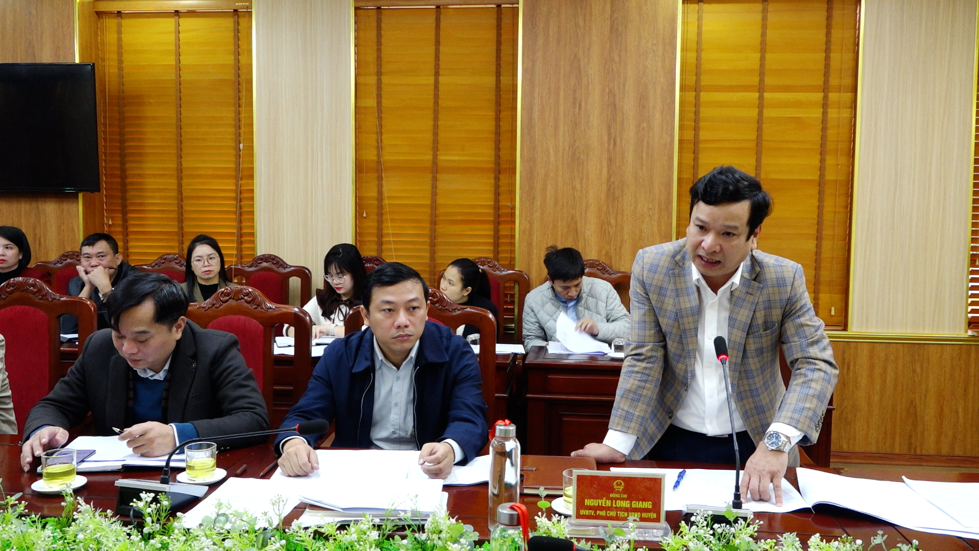 Đồng chí Nguyễn Long Giang - Uỷ viên BTV Huyện uỷ, Phó Chủ tịch UBND huyện phát biểu tại hội nghị.