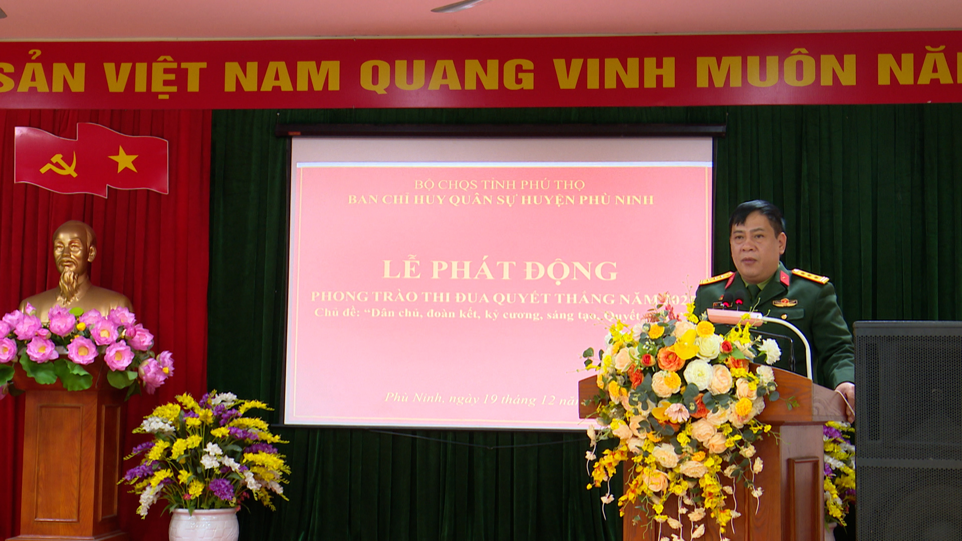 (Phù Ninh)- Chiều 19/12, Ban Chỉ huy Quân sự (CHQS) huyện Phù Ninh tổ chức Lễ phát động Phong trào thi đua Quyết thắng năm 2025. Tới dự có Thượng tá Đỗ Cao Cường – Chính trị viên Ban CHQS huyện; các đồng chí lãnh đạo, cán bộ, nhân viên Ban CHQS huyện; Chỉ huy trưởng, Chính trị viên phó Ban CHQS các xã, thị trấn, Phụ trách các đơn vị Tự vệ trên địa bàn huyện.