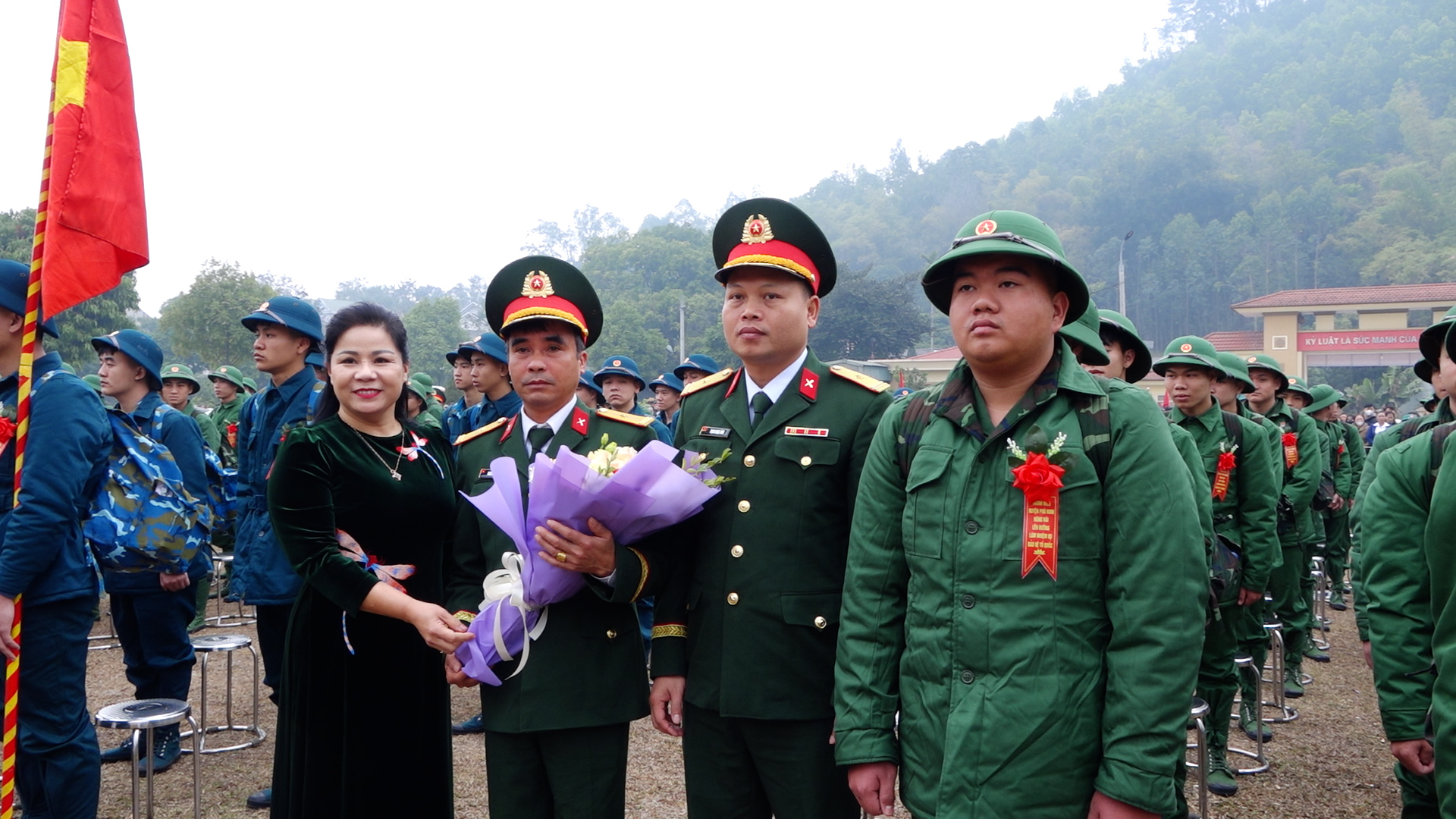 Đồng chí Nguyễn Thị Tố Uyên - TUV, Bí thư Huyện uỷ, Chủ tịch HĐND huyện, Bí thư Đảng bộ quân sự huyện tặng hoa cho các đơn vị nhận quân và động viên các tân binh lên đường nhập ngũ.