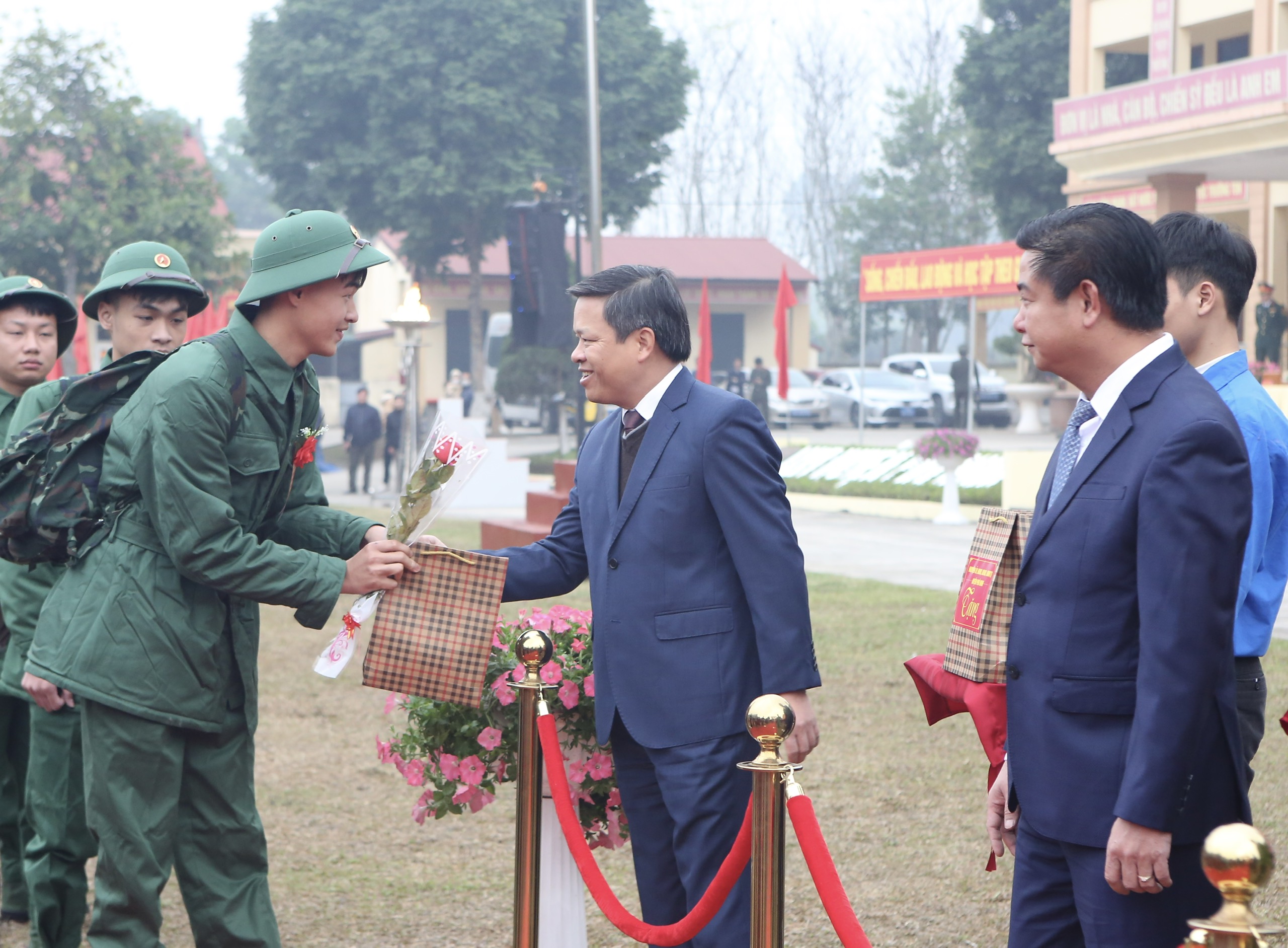 Đồng chí Phan Trọng Tấn - Uỷ viên BTV Tỉnh uỷ, Phó Chủ tịch UBND tỉnh và các đồng chí lãnh đạo tặng hoa cho các đơn vị nhận quân và động viên các tân binh lên đường nhập ngũ.