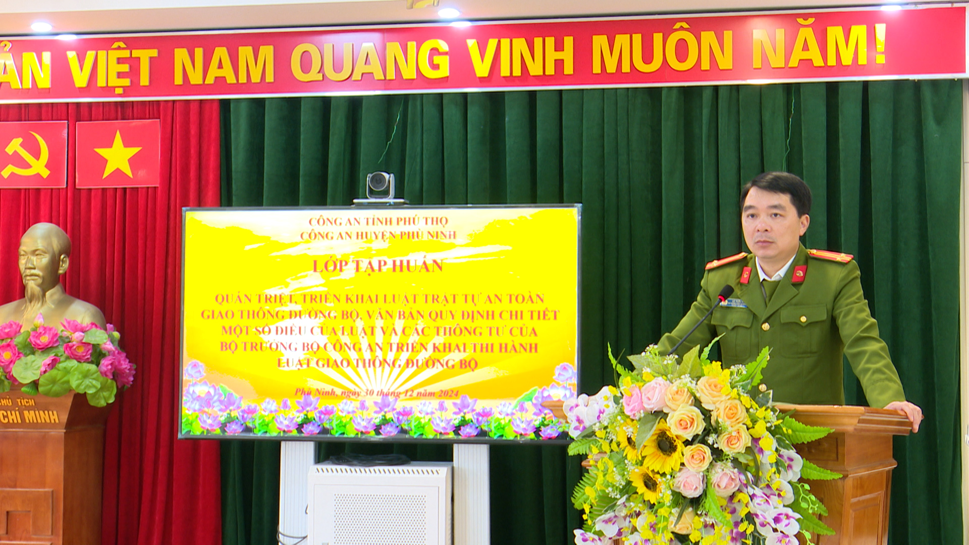 (Phù Ninh)- Chiều 30/12, Công an huyện Phù Ninh tổ chức Lớp tập huấn Luật và các văn bản quy định chi tiết một số điều của Luật và các Thông tư của Bộ trưởng Bộ Công an, triển khai thi hành Luật Trật tự ATGT đường bộ năm 2024. Tới dự có các đồng chí đại diện lãnh đạo Công an huyện. Tham gia lớp tập huấn có gần 50 đồng chí là cán bộ, chiến sỹ Cảnh sát giao thông – Trật tự; Đội trưởng các đội nghiệp vụ; Trưởng Công an các xã, thị trấn và các đồng chí làm đăng ký xe tại 9 xã, thị trấn trên địa bàn.