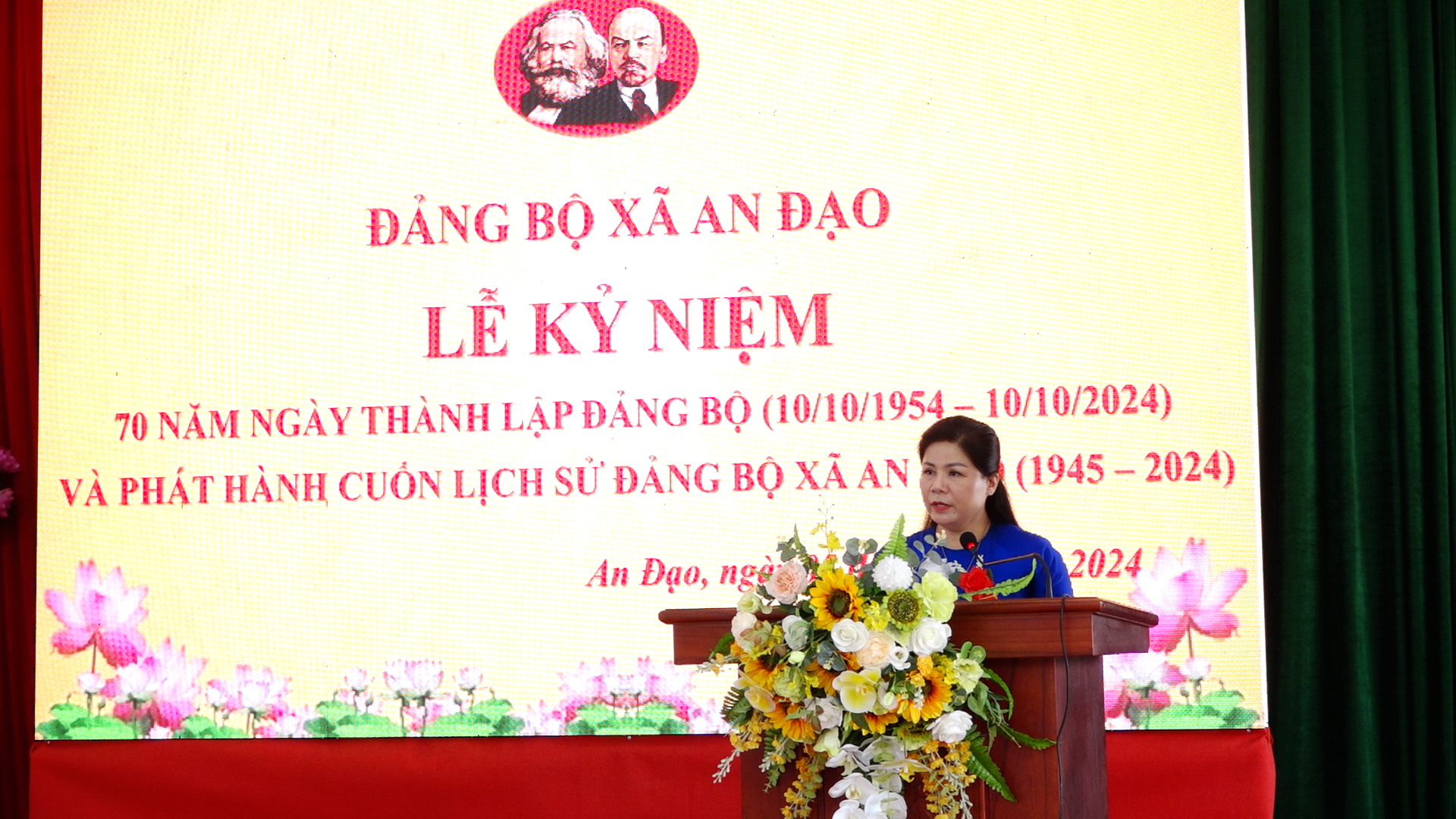 Phát biểu tại lễ kỷ niệm đồng chí Nguyễn Thị Tố Uyên – Tỉnh uỷ viên, Bí thư Huyện uỷ, Chủ tịch HĐND huyện gửi lời chúc mừng, chung vui cùng Đảng bộ, chính quyền và nhân dân xã An Đạo với những thành tựu đã đạt được trong 70 năm qua. Để kế thừa và phát huy những kết quả đã đạt được, khắc phục những khó khăn, quyết tâm thực hiện thắng lợi mục tiêu Nghị quyết Đại hội Đảng các cấp nhiệm kỳ 2020-2025 đã đề ra đồng chí đề nghị cấp uỷ Đảng, chính quyền, UBMTTQ và các đoàn thể chính trị xã hội của xã tiếp tục quán triệt sâu sắc các Chỉ thị, Nghị quyết của Đảng, chính sách pháp luật của nhà nước. Phát huy tinh thần đoàn kết sáng tạo tuyên truyền vận động nhân dân trong xã thực hiện nhiệm vụ phát triển kinh tế xã hội, xây dựng hệ thống chính trị thực sự trong sạch vững mạnh. Phát huy lợi thế của địa phương chú trọng phát triển các mô hình sản xuất hàng hoá có hiệu quả, mở rộng sản xuất nông nghiệp sạch, nông nghiệp hữu cơ, thu hút đầu tư vào vùng sản xuất nông nghiệp ứng dụng công nghệ cao, quan tâm xây dựng các sản phẩm OCOP tạo công ăn việc làm, tăng thu nhập cho người dân. Tiếp tục thực hiện hiệu quả các Nghị quyết chuyên đề của Ban Chấp hành, Ban Thường vụ Huyện uỷ; tăng cường quản lý nhà nước về đất đai, khai thác khoáng sản; chỉ đạo thực hiện tốt công tác giải phóng mặt bằng thực hiện các dự án trên địa bàn; quan tâm đẩy mạnh các hoạt động văn hoá xã hội, các phong trào thi đua, giữ gìn an ninh trật tự, phấn đấu xây dựng xã Nông thôn mới nâng cao trong thời gian tới. Đồng chí Bí thư Huyện uỷ tin tưởng với truyền thống 70 năm chiến đấu, xây dựng và trưởng thành; Đảng bộ, chính quyền và nhân dân xã An Đạo sẽ luôn phát huy tinh thần đoàn kết, đổi mới, sáng tạo vượt qua khó khăn thực hiện thắng lợi nhiệm vụ chính trị đã đề ra, vững bước trên con đường hội nhập xây dựng quê hương An Đạo ngày càng phát triển.