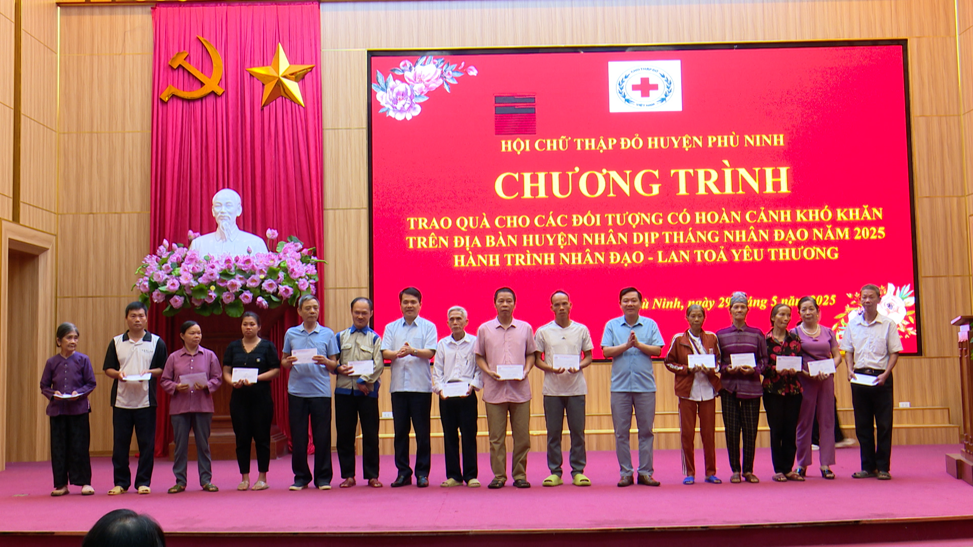 (Phù Ninh)- Hưởng ứng “Tháng Nhân đạo” năm 2025, sáng ngày 29/5/2025, Hội Chữ thập đỏ huyện Phù Ninh phối hợp với Hội Chữ thập đỏ tỉnh Phú Thọ tổ chức chương trình trao quà cho các đối tượng có hoàn cảnh đặc biệt khó khăn trên địa bàn huyện. Tham dự chương trình có đồng chí Lê Thị Quỳnh Trang – Chủ tịch Hội Chữ thập đỏ tỉnh Phú Thọ. Về phía huyện Phù Ninh có các đồng chí: Nguyễn Quang Vinh – Phó Bí thư Thường trực Huyện ủy; Ngô Quang Chính – Ủy viên Ban Thường vụ Huyện ủy, Phó Chủ tịch HĐND huyện; Trịnh Đức Lai – Ủy viên Ban Thường vụ Huyện ủy, Phó Chủ tịch UBND huyện; Hán Trung Kết – Ủy viên Ban Thường vụ Huyện ủy, Chủ tịch Ủy ban MTTQ Việt Nam huyện, cùng đại diện lãnh đạo một số phòng, ban, ngành huyện.