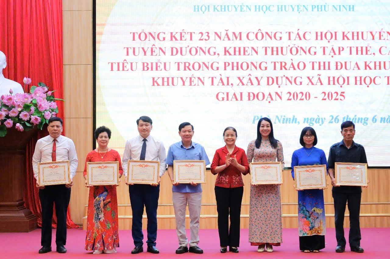 Dịp này, Hội Khuyến học tỉnh đã tặng giấy khen cho 13 tập thể, 8 cá nhân; Hội khuyến học huyện khen thưởng 14 tập thể, 16 cá nhân vì có thành tích xuất sắc trong công tác khuyến học, khuyến tài, xây dựng xã hội học tập giai đoạn 2020 - 2025.