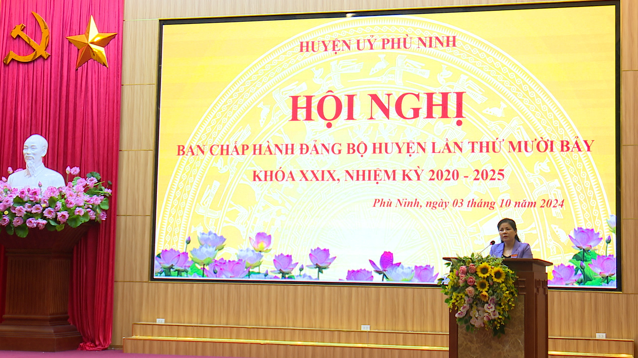 (Phù Ninh)- Ngày 3/10/2024, Ban Chấp hành Đảng bộ huyện Phù Ninh tổ chức hội nghị lần thứ XVII, khoá XXIX, nhiệm kỳ 2020 -2025 để quán triệt triển khai các văn bản mới của Trung ương, của tỉnh và thông qua các dự thảo báo kết quả thực hiện nhiệm vụ chính trị 9 tháng đầu năm, phương hướng nhiệm vụ 3 tháng cuối năm 2024. Dự hội nghị có đồng chí Nguyễn Thị Tố Uyên – Tỉnh uỷ viên, Bí thư Huyện uỷ, Chủ tịch HĐND huyện; đồng chí Nguyễn Hữu Nhật – Phó Bí thư Huyện uỷ, Chủ tịch UBND huyện; đồng chí Nguyễn Quang Vinh – Phó Bí thư Thường trực Huyện uỷ; các đại biểu đại diện các Ban xây dựng Đảng tỉnh, Văn phòng Tỉnh uỷ; các đồng chí Uỷ viên Ban Chấp hành Đảng bộ huyện, Uỷ viên Uỷ ban Kiểm tra Huyện uỷ; Trưởng các đoàn thể chính trị - xã hội huyện; Trưởng các phòng chuyên môn, đơn vị thuộc huyện; Bí thư Đảng uỷ, Chủ tịch UBND các xã, thị trấn; đồng chí Bí thư các chi, Đảng bộ khối cơ quan trực thuộc Huyện uỷ.