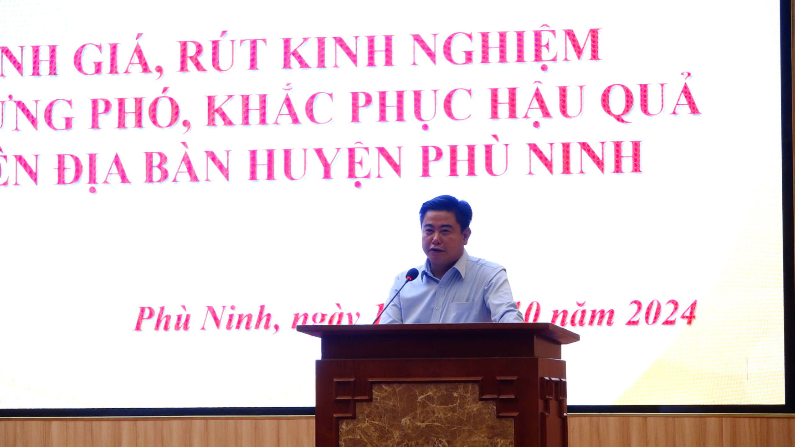 Kết luận hội nghị, đồng chí Nguyễn Hữu Nhật – Phó Bí thư Huyện ủy, Chủ tịch UBND huyện ghi nhận sự nỗ lực của các cấp, ngành, đơn vị liên quan trong công tác phòng, chống, ứng phó, khắc phục hậu quả bão số 3. Đồng chí lưu ý một số vấn đề về huy động lực lượng, phương tiện trong PCTT và các tình huống đặc biệt, việc vận hành cơ chế lãnh đạo, chỉ huy, điều hành phải linh hoạt, bảo đảm tốt thông tin chỉ đạo; huy động được sự vào cuộc của cả hệ thống chính trị, lực lượng vũ trang, các tầng lớp Nhân dân; phát huy truyền thống đoàn kết, thống nhất, huy động sức mạnh tổng hợp vượt qua khó khăn, thách thức. Công tác PCTT phải được tiến hành liên tục, đảm bảo từ sớm, từ xa; không chủ quan, không lúng túng, bị động trước các tình huống phát sinh; nâng cao công tác tham mưu, đề xuất trong ứng phó thiên tai, đặc biệt xử lý giờ đầu ở các sự cố đảm bảo kịp thời, chính xác. Các đơn vị chức năng của huyện phải khẩn trương phối hợp với các bộ, ngành liên quan xử lý cấp bách các vị trí sạt lở đê, bờ vở sông, sạt lở đất, công trình đê, kè, cống, công trình giao thông. Đồng chí cũng nhấn mạnh một số nhiệm vụ thời gian tới: Các phòng, cơ quan, đơn vị, các địa phương tiếp tục triển khai nghiêm túc chỉ đạo của Trung ương, của tỉnh, của huyện về tập trung khắc phục thiệt hại của cơn bão số 3. Rà soát, điều chỉnh Kế hoạch phòng, chống thiên tai giai đoạn 2021-2025, phương án ứng phó với các cấp độ rủi ro thiên tai, kế hoạch hoạt động năm 2024 của các phòng, đơn vị theo nhiệm vụ, lĩnh vực phụ trách, đảm bảo phù hợp với thực tế địa phương và đơn vị. Tiếp tục rà soát, bố trí sắp xếp, di dời người dân ở vùng có nguy cơ cao xảy ra thiên tai, nhất là khu vực nguy cơ xảy ra sạt lở đất, lũ ống, lũ quét đến nơi an toàn; chỉ đạo các lực lượng hỗ trợ, khắc phục hậu quả (sạt lở, sụt lún...) tại các vị trí trên địa bàn các xã ven sông; Hỗ trợ người dân bị ảnh hưởng ổn định đời sống sau bão lũ. Duy trì trực Ban Chỉ huy PCTT&TKCN tại các xã, thị trấn; thường xuyên theo dõi, nắm bắt tình hình mưa, bão, kịp thời xử lý khi có tình huống xảy ra. Báo cáo thường xuyên về BCH PCTT&TKCN huyện theo quy định. Tăng cường công tác đảm bảo an ninh – trật tự trên địa bàn huyện. Đẩy mạnh công tác tuyên truyền, thông tin, truyền thông phổ biến nội dung, kiến thức về phòng chống thiên tai; truyền tải kịp thời, đầy đủ, chính xác các bản tin dự báo khí tượng, thủy văn, tình hình thiên tai và các nội dung về công tác PCTT trên địa bàn huyện. Tăng cường tập huấn, diễn tập cho các đối tượng trực tiếp làm công tác phòng chống thiên tai các xã, thị trấn và cộng đồng đảm bảo sát với các loại hình thiên tai và tình hình thực tế tại các xã, thị trấn. Nâng cao năng lực, kỹ năng phòng, chống thiên tai, sơ tán dân, cứu hộ, cứu nạn cho các lực lượng chuyên trách, bán chuyên trách và lực lượng nhân dân địa phương; nâng cao khả năng ứng cứu tại chỗ cho các tổ chức, cá nhân, cộng đồng.