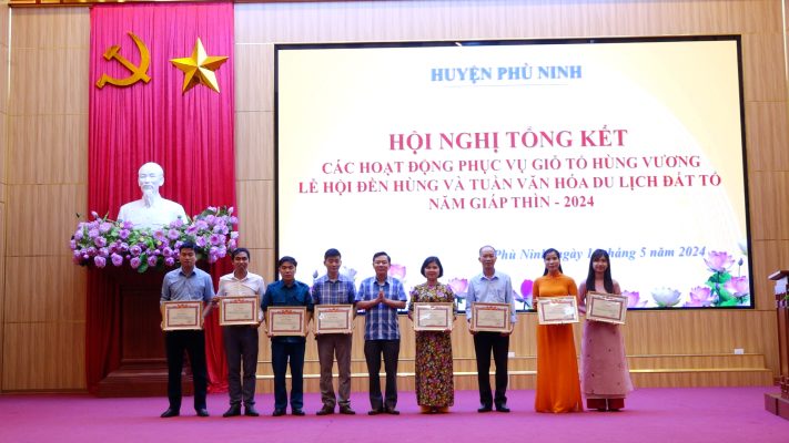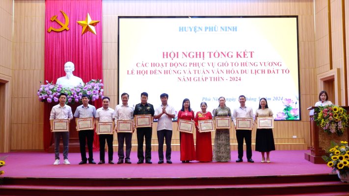 Tại hội nghị, các đại biểu đã được nghe báo cáo tổng kết các hoạt động của huyện Phù Ninh tham gia Giỗ Tổ Hùng Vương – Lễ hội Đền Hùng và Tuần Văn hóa – Du lịch Đất Tổ năm 2024. Được sự quan tâm, chỉ đạo của Huyện ủy, HĐND, UBND huyện, sự phối hợp của các ban, ngành đoàn thể và các xã, thị trấn, các đơn vị, doanh nghiệp trên địa bàn, quy mô, chất lượng tổ chức các hoạt động tham gia phục vụ Giỗ tổ Hùng Vương – Lễ hội Đền Hùng và Tuần văn hóa – Du lịch Đất Tổ năm 2024 của huyện Phù Ninh tạo điểm nhấn, thu hút sự quan tâm của du khách khi hành hương đến Phú Thọ, nhiều hoạt động được đổi mới, nâng cao. Huyện Phù Ninh đã tổ chức đoàn đại biểu dâng hương tại Đền Thượng, Đền thờ Quốc Tổ Lạc Long Quân, dâng hoa tại bức phù điêu “Bác Hồ nói chuyện với cán bộ, chiến sỹ Đại đoàn quân tiên phong” đảm bảo trang nghiêm, thành kính, đúng nghi thức của Ban tổ chức cấp tỉnh. Đội thi gói, nấu bánh Chưng và đội thi giã bánh Giầy đạt giải Ba. Đội thi Liên hoan Văn nghệ quần chúng- Hát Xoan và dân ca Phú Thọ đạt giải B toàn đoàn, 1 giải A và 2 giải B tiết mục. Tham gia bóng đá, các môn thể thao truyền thống (cờ tướng, đẩy gậy), trong đó, môn đẩy gậy đạt kết quả cao với 06 giải nhất ,1 giải nhì và 2 giải ba. Trại Văn hóa huyện Phù Ninh được thiết kế ấn tượng với phong cách vừa hiện đại, vừa truyền thống, vừa thể hiện được những đặc trưng văn hóa riêng của huyện; không gian trưng bày của trại thể hiện rõ nét văn hoá thời đại Hùng Vương, đồng thời mang nét đặc sắc của quê hương Phù Ninh qua các sản phẩm trưng bày như như nón lá Gia Thanh, chè Chùa Tà, mì gạo làng Vai xã Trị Quận, mật ong King’s Honey, bánh sắn Phong Châu,…, Tại hội nghị, 11 tập thể, 9 cá nhân có thành tích xuất sắc tham gia phục vụ Giỗ Tổ Hùng Vương – Lễ hội Đền Hùng và Tuần Văn hoá – Du lịch Đất Tổ năm 2024 đã được nhận Giấy khen của UBND huyện.