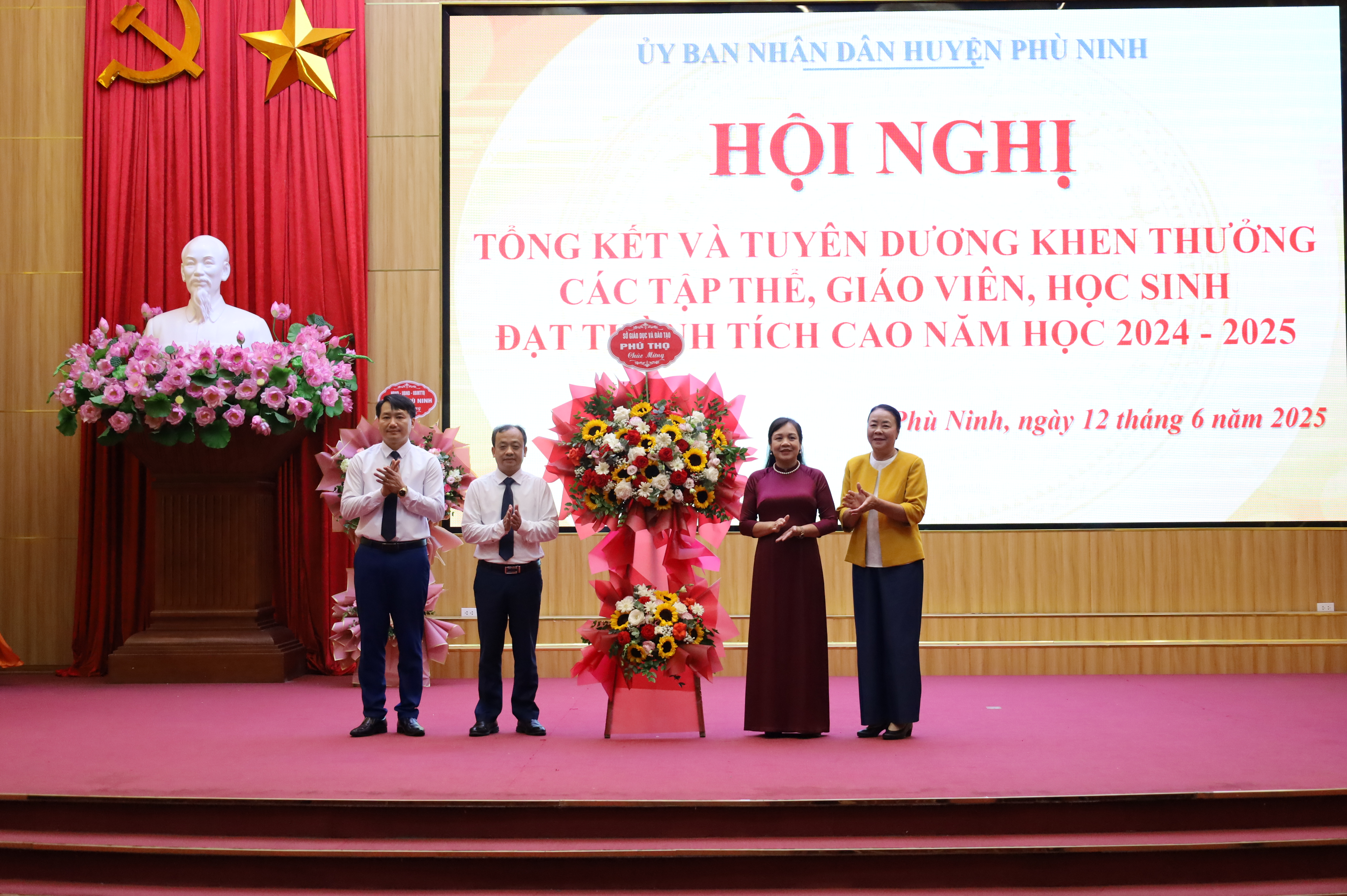Nhân dịp này, lãnh đạo Sở Giáo dục và Đào tạo, Hội Khuyến học tỉnh và các đồng chí lãnh đạo huyện Phù Ninh đã tặng lẵng hoa tươi thắm chúc mừng thành tích của ngành Giáo dục – Đào tạo huyện trong năm học 2024-2025; các tập thể, giáo viên, học sinh có thành tích xuất sắc đã được nhận khen thưởng.
