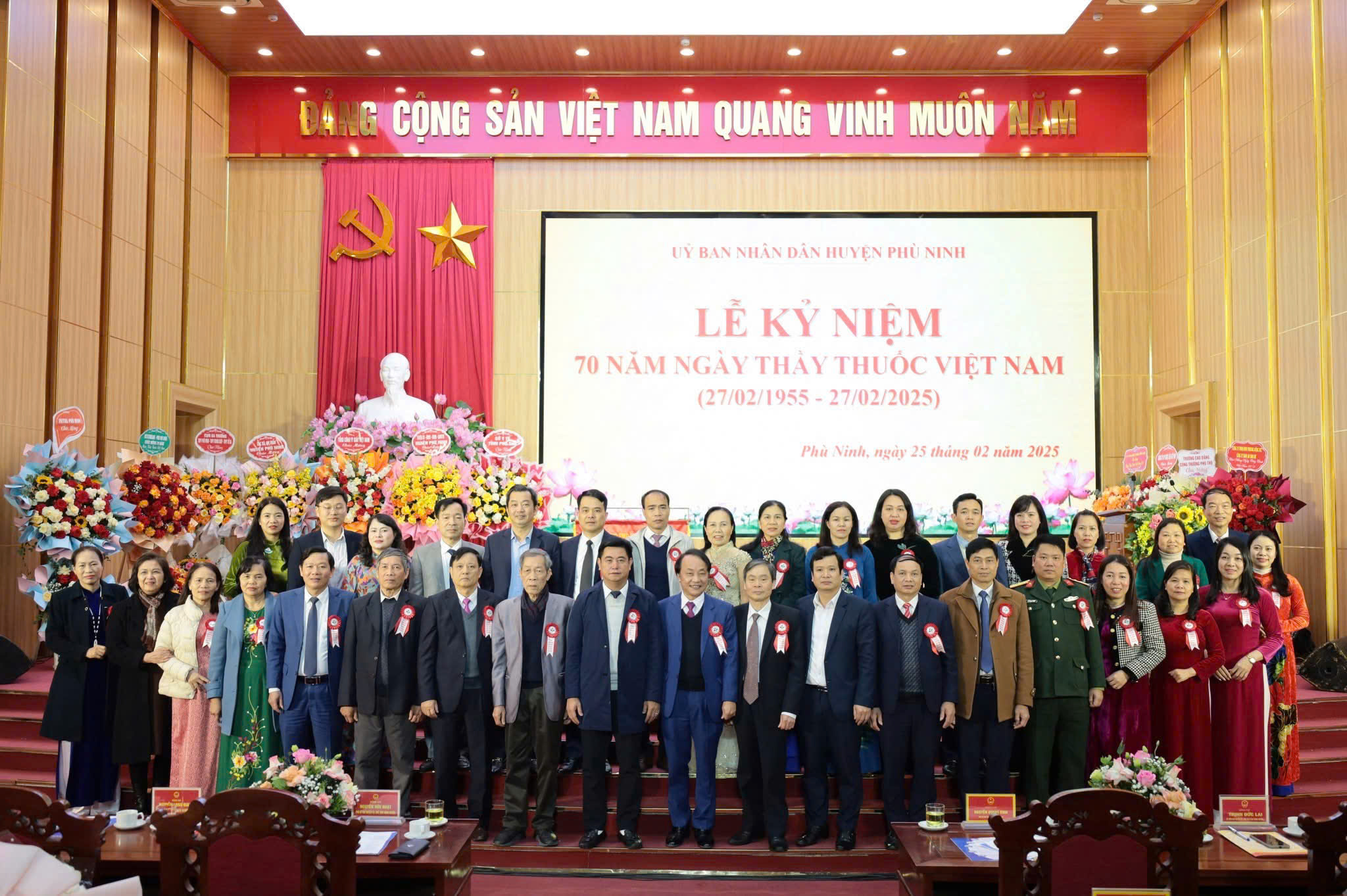 (Phù Ninh)- Chiều ngày 25/2/2025, huyện Phù Ninh tổ chức lễ kỷ niệm 70 năm Ngày Thầy thuốc Việt Nam (27/2/1955 - 27/2/2025). Dự buổi lễ có đồng chí Nguyễn Hữu Nhật – Phó Bí thư Huyện uỷ, Chủ tịch UBND huyện, đồng chí Nguyễn Quang Vinh – Phó Bí thư Thường trực Huyện uỷ, các đồng chí Uỷ viên BTV Huyện uỷ, lãnh đạo các phòng, ban, cơ quan, đơn vị thuộc huyện; lãnh đạo các xã, thị trấn; lãnh đạo, cán bộ, viên chức, người lao động Trung tâm Y tế huyện; các đồng chí nguyên lãnh đạo Trung tâm Y tế qua các thời kỳ; đại diện các cơ sở hành nghề y dược tư nhân trên địa bàn.