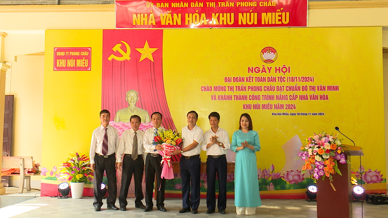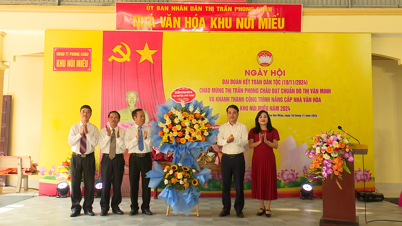 (Phù Ninh)- Sáng ngày 10/11, Khu Núi Miếu, thị trấn Phong Châu tổ chức Ngày Đại đoàn kết toàn dân tộc (18/11/2024), Chào mừng thị trấn Phong Châu đạt chuẩn đô thị văn minh và khánh thành công trình nâng cấp nhà văn hóa khu dân cư. Tới dự và chung vui có đồng chí Nguyễn Quang vinh – Phó Bí thư Thường trực Huyện ủy; đồng chí Ngô Quang Chính- Ủy viên BTV Huyện ủy, Phó chủ tịch HĐND huyện, các đồng chí lãnh đạo đại diện các phòng ban, ngành, đoàn thể huyện Phù Ninh. Các đồng chí lãnh đạo Đảng ủy, HĐND, UBND, UB MTTQ, các ban ngành đoàn thể thị trấn Phong Châu, các đồng chí Bí thư Chi bộ, Trưởng khu dân cư trên địa bàn.