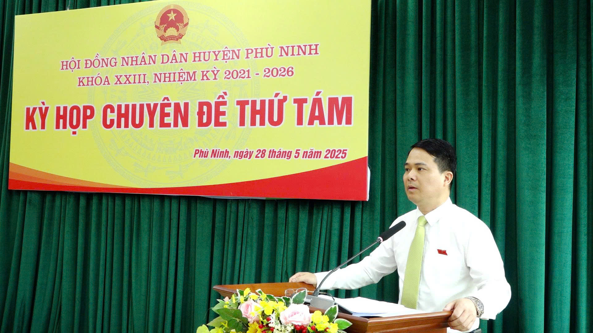 (Phù Ninh)- Ngày 28/5/2025, HĐND huyện Phù Ninh khóa XXIII, nhiệm kỳ 2021 - 2026 tổ chức kỳ họp chuyên đề thứ Tám thông qua các Tờ trình về việc đề nghị phê chuẩn quyết toán thu ngân sách nhà nước trên địa bàn; thu, chi ngân sách địa phương năm 2024; Tờ trình về việc đề nghị bãi bỏ Nghị quyết số 01/2021/NQ-HĐND ngày 23/8/2021 về việc phân cấp thẩm quyền quyết định chủ trương đầu tư dự án đầu tư công sử dụng vốn ngân sách cấp huyện. Đồng chí Ngô Quang Chính - Ủy viên BTV Huyện ủy, Phó chủ tịch HĐND huyện chủ tọa kỳ họp. Dự kỳ họp có đồng chí Nguyễn Hữu Nhật – Phó Bí thư Huyện uỷ, Chủ tịch UBND huyện, đồng chí Nguyễn Quang Vinh – Phó Bí thư Thường trực Huyện ủy; các ông bà Uỷ viên BTV Huyện uỷ; các ông bà đại biểu HĐND huyện Phù Ninh khóa XXIII, nhiệm kỳ 2021 – 2026; Các ông bà thành viên UBND huyện; Chủ tịch UBND các xã, thị trấn.