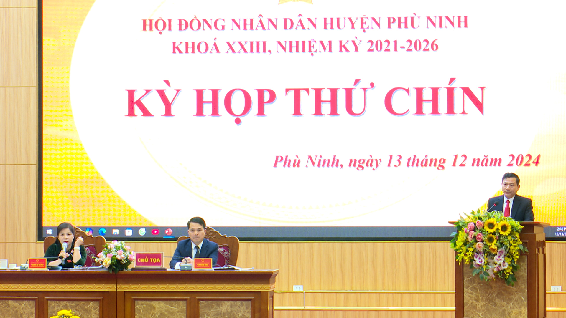 (Phù Ninh)- Chiều ngày 13/12/2024, HĐND huyện Phù Ninh khoá XXIII, nhiệm kỳ 2021-2026 tiếp tục tổ chức kỳ họp thứ Chín. Chủ tọa Kỳ họp gồm các đồng chí Nguyễn Thị Tố Uyên – Tỉnh uỷ viên, Bí thư Huyện uỷ, Chủ tịch HĐND huyện; đồng chí Ngô Quang Chính – Uỷ viên BTV, Phó Chủ tịch HĐND huyện. Tham dự kỳ họp có đại biểu Văn phòng đoàn đại biểu Quốc hội và HĐND tỉnh Phú Thọ; đồng chí Nguyễn Hữu Nhật – Phó Bí thư Huyện uỷ, Chủ tịch UBND huyện; đồng chí Nguyễn Quang Vinh – Phó Bí thư TT Huyện uỷ; các đồng chí Ủy viên BTV Huyện ủy; các đồng chí Ủy viên UBND huyện; Trưởng các phòng, ban, cơ quan trực thuộc huyện; Thủ trưởng các cơ quan, đơn vị trên địa bàn; Hiệu trưởng các trường THPT; Trường Cao đẳng Công thương Phú Thọ; các đồng chí Bí thư Đảng ủy, Chủ tịch HĐND, Chủ tịch UBND, Phó Chủ tịch HĐND các xã, thị trấn.