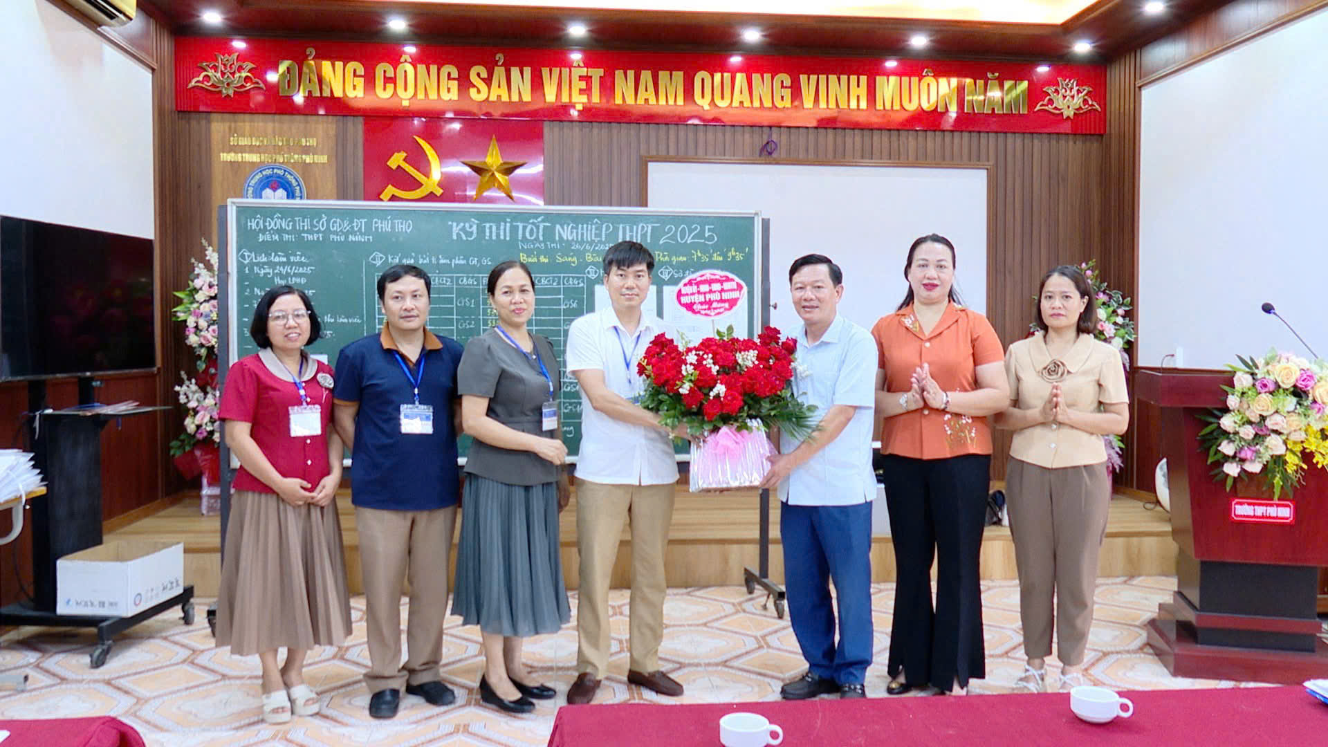 Phát biểu động viên, tặng hoa, quà tại các địa điểm thi, Lãnh đạo huyện Phù Ninh ghi nhận các điểm thi đã có sự chuẩn bị chu đáo cho Kỳ thi tốt nghiệp THPT năm 2025. Nhấn mạnh năm nay kỳ thi có nhiều đổi mới như: là năm đầu tiên thi theo chương trình GDPT năm 2018; giảm số lượng môn thi còn 4 môn gồm: Toán, Ngữ văn và 2 môn tự chọn… Để Kỳ thi tốt nghiệp THPT năm 2025 đạt kết quả cao nhất, đề nghị các điểm thi cần lưu ý an toàn từ khâu chuẩn bị cho đến khi kết thúc kỳ thi; chủ động trước các tình huống có thể xảy ra để có phương án xử lý kịp thời. Đồng thời quan tâm tạo điều kiện thuận lợi đối với cán bộ giáo viên làm công tác coi thi, phục vụ kỳ thi. Ban Giám hiệu các trường đặt điểm thi cần tiếp tục khảo sát lại, tổ chức triển khai các công việc còn lại để đảm bảo về cơ sở vật chất phục vụ tốt nhất cho kỳ thi, nhằm hướng đến một kỳ thi an toàn, nghiêm túc, hiệu quả, đúng quy chế.