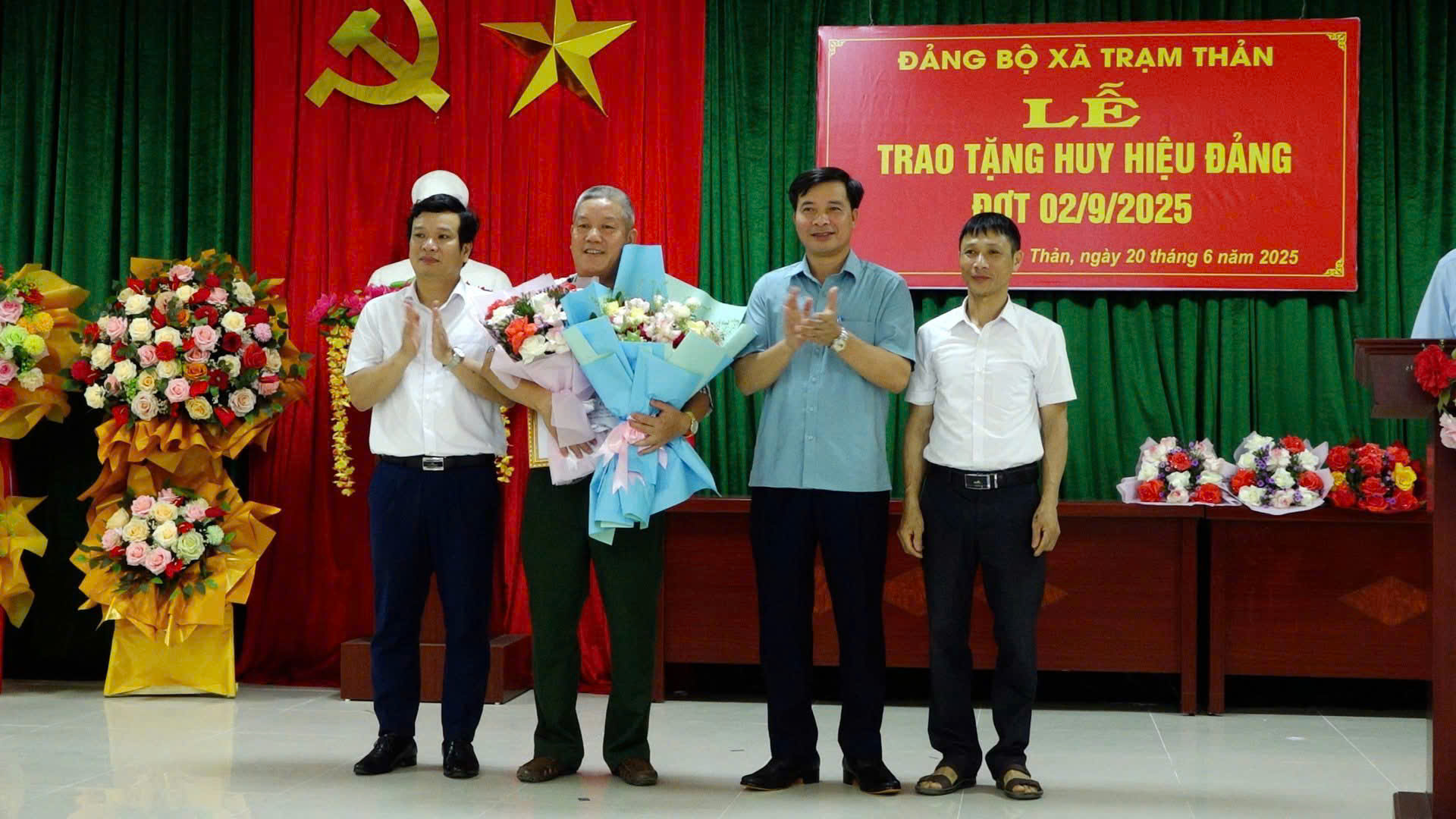Đồng chí Nguyễn Long Giang đã trao huy hiệu 60 năm tuổi đảng, tặng hoa chúc mừng 2 đảng viên của đảng bộ xã Trạm Thản. Đảng viên Đỗ Văn Tý sinh năm 1944; đảng viên Lương Ngọc Thái sinh năm 1944 là đảng viên chi bộ 4 xã Trạm Thản. Đồng chí mong muốn các đảng viên được trao tặng Huy hiệu Đảng tiếp tục giữ vững bản lĩnh chính trị, phẩm chất cách mạng của người đảng viên, đoàn kết, đóng góp công sức, trí tuệ vào xây dựng và phát triển quê hương, tham gia xây dựng tổ chức Đảng ở địa phương trong sạch, vững mạnh, luôn là tấm gương sáng cho thế hệ trẻ noi theo. Cũng trong đợt này Đảng bộ xã Trạm Thản có 5 đồng chí được nhận huy hiệu từ 30 -50 năm tuổi đảng.