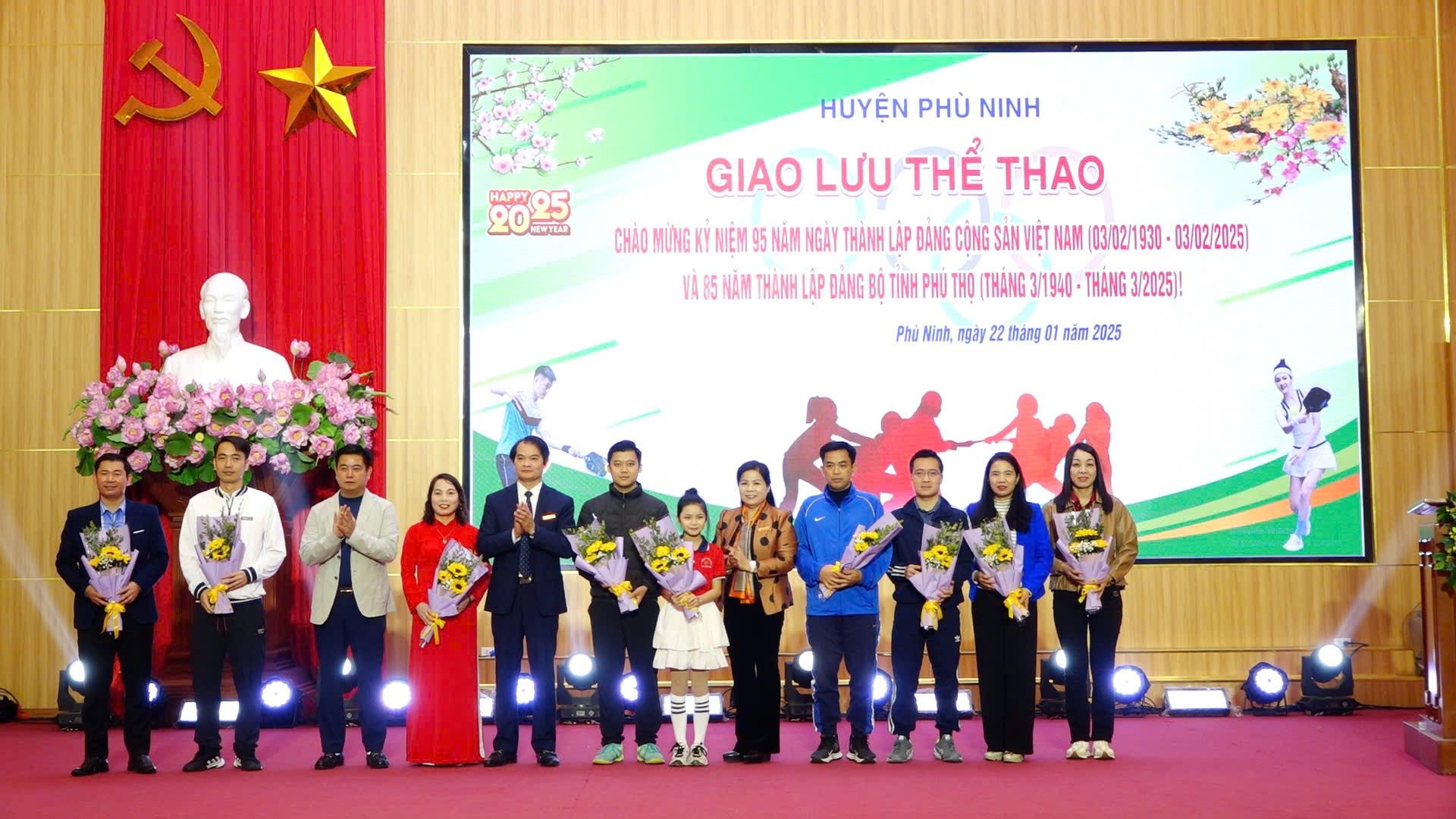 (Phù Ninh)- Sáng ngày 22/1/2025, huyện Phù Ninh tổ chức chương trình đồng diễn dân vũ và giao lưu thể thao chào mừng kỷ niệm 95 năm ngày thành lập Đảng Cộng sản Việt Nam, 85 năm ngày thành lập Đảng bộ tỉnh Phú Thọ và mừng Xuân Ất Tỵ năm 2025. Tới dự có đồng chí Nguyễn Thị Tố Uyên – Tỉnh uỷ viên, Bí thư Huyện ủy, Chủ tịch HĐND huyện; đồng chí Nguyễn Hữu Nhật – Phó Bí thư Huyện uỷ, Chủ tịch UBND huyện; đồng chí Nguyễn Quang Vinh – Phó bí thư Thường trực Huyện ủy; các đồng chí trong BTV Huyện ủy; lãnh đạo, công chức, viên chức, người lao động Cơ quan khối Đảng – Đoàn thể, Cơ quan khối Chính quyền huyện; các đơn vị tham gia giao lưu thể thao, trọng tài, đội dân vũ trường Tiểu học Giấy Bãi Bằng, đội dân vũ Hội Liên hiệp phụ nữ các xã, thị trấn.