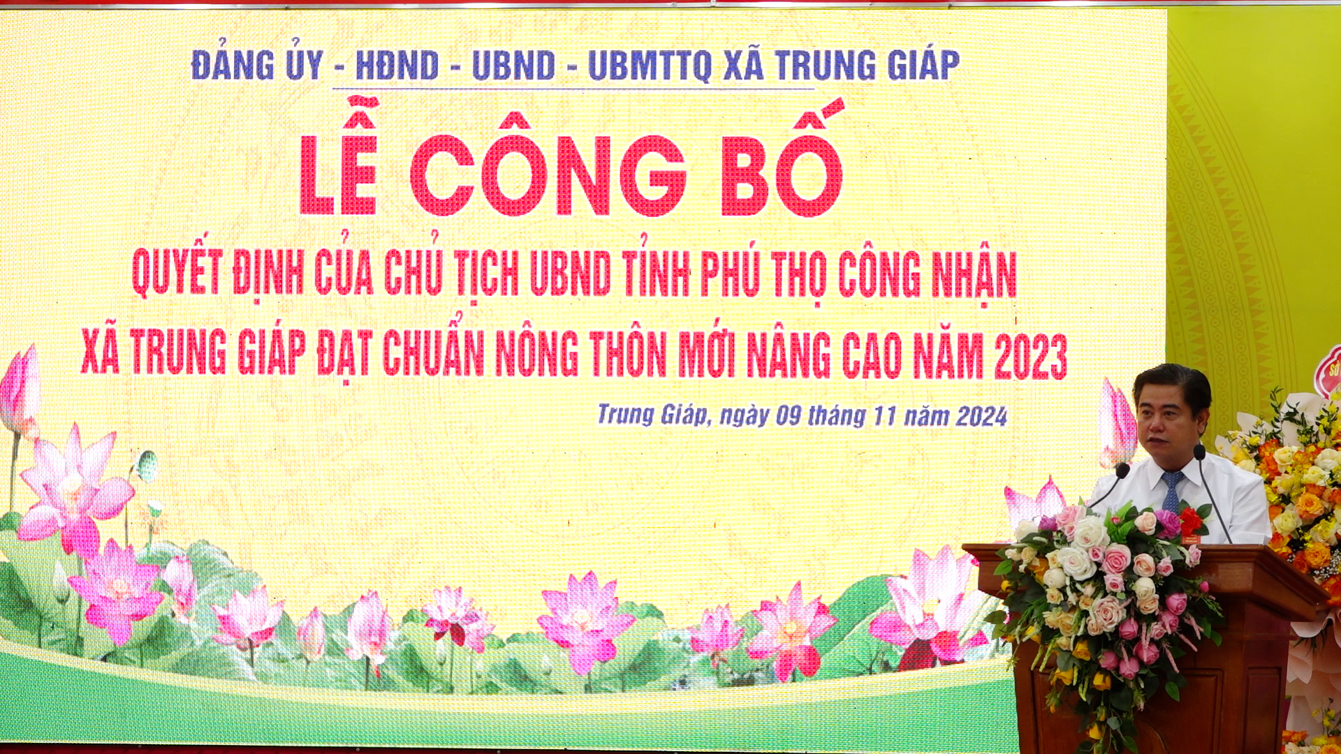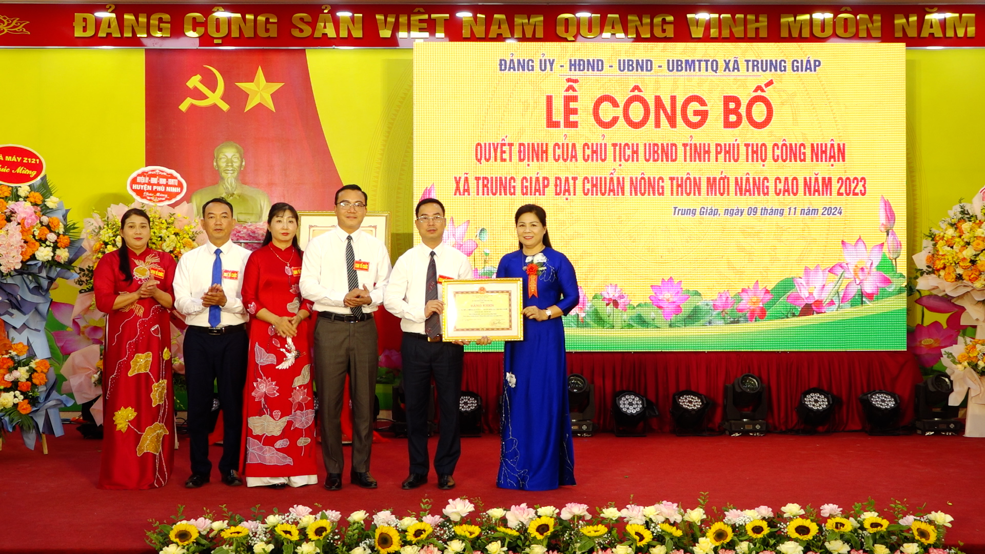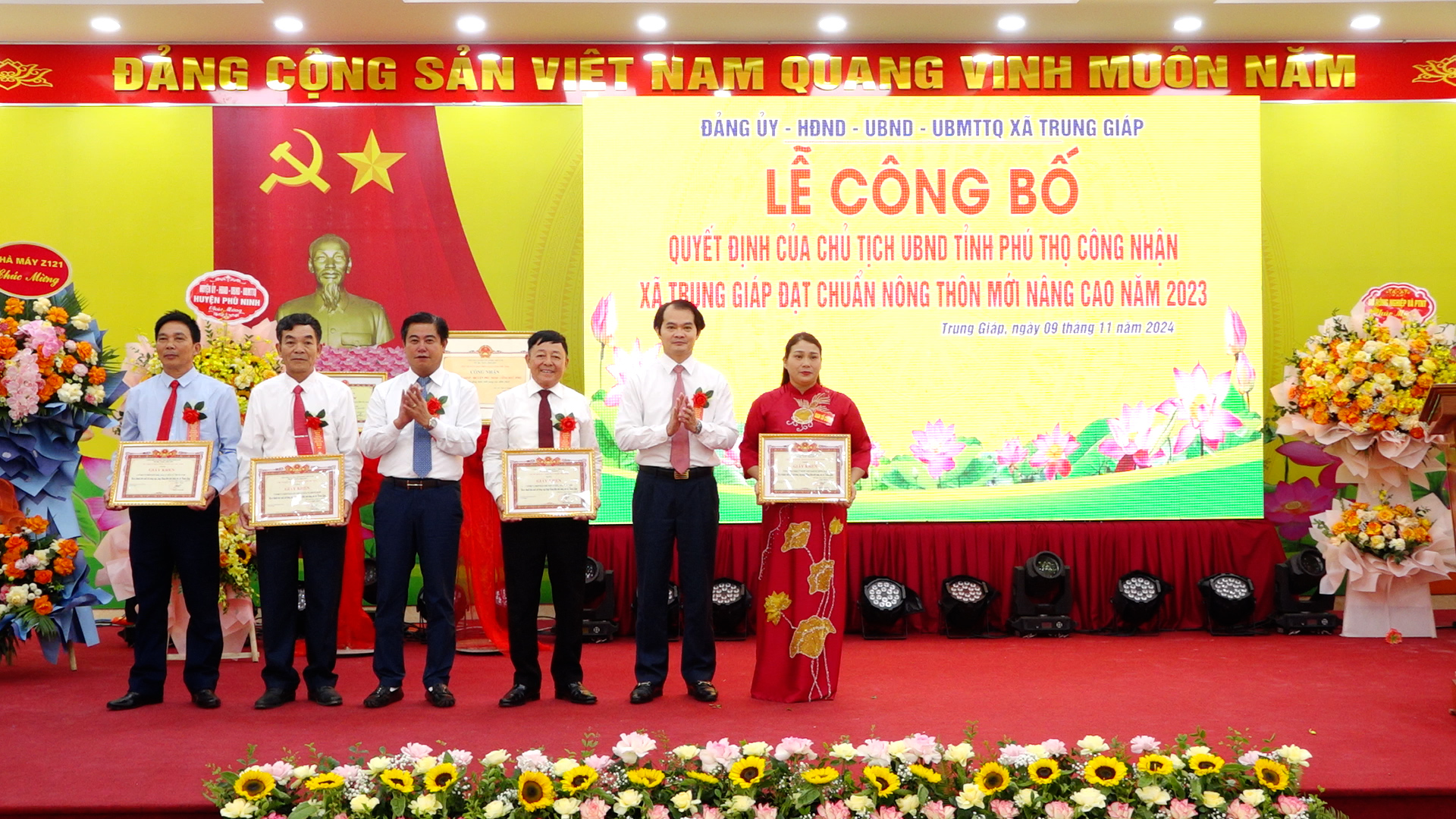 Được sự uỷ quyền của Chủ tịch UBND tỉnh Phú Thọ, đồng chí Nguyễn Hữu Nhật - Phó Bí thư Huyện uỷ, Chủ tịch UBND huyện đã trao bằng công nhận xã Trung Giáp đạt chuẩn nông thôn mới nâng cao năm 2023. Nhân dịp này, đồng chí Nguyễn Thị Tố Uyên - Tỉnh uỷ viên, Bí thư Huyện uỷ, Chủ tịch HĐND huyện; đồng chí Nguyễn Hữu Nhật – Phó Bí thư Huyện uỷ, Chủ tịch UBND huyện; đồng chí Nguyễn Quang Vinh – Phó Bí thư TT Huyện uỷ; đồng chí Hán Trung Kết - Uỷ viên Ban Thường vụ Huyện uỷ, Chủ tịch UBMTTQ huyện đã trao tặng lẵng hoa tươi thắm chúc mừng Đảng bộ, chính quyền và nhân dân xã Trung Giáp.