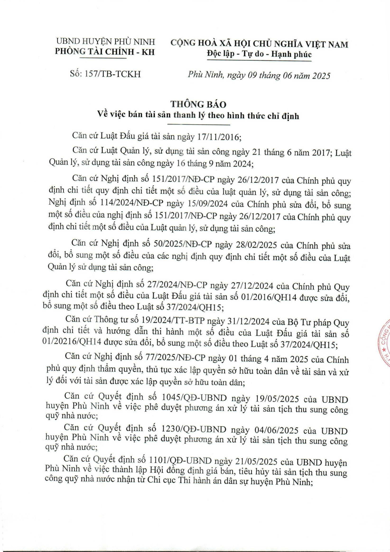 (Phù Ninh)- Ngày 09/6/2025, phòng Tài chính - Kế hoạch huyện Phù Ninh ban hành thông báo số 157/TB-UBND về việc bán tài sản thanh lý theo hình thức chỉ định.