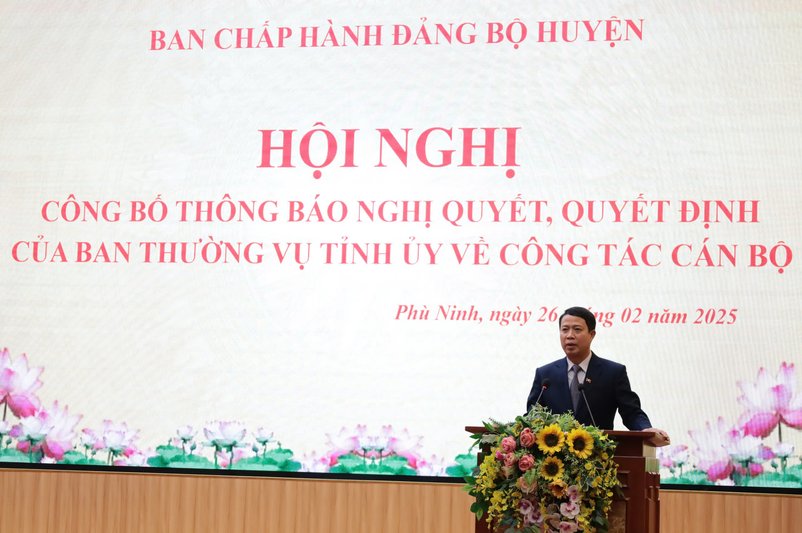 Tại hội nghị, đại diện Ban Tổ chức Tỉnh ủy đã công bố Quyết định điều động, chỉ định đồng chí Ngô Đức Thịnh – Tỉnh uỷ viên, Giám đốc Sở Nội vụ tham gia Ban Chấp hành, Ban Thường vụ và giữ chức vụ Bí thư Huyện ủy Phù Ninh nhiệm kỳ 2020 – 2025. Trao Quyết định, phát biểu chúc mừng và giao nhiệm vụ cho đồng chí tân Bí thư Huyện uỷ Phù Ninh, đồng chí Bùi Đình Thi – Uỷ viên BTV Tỉnh uỷ, Trưởng Ban Tổ chức Tỉnh uỷ nhấn mạnh: đồng chí Ngô Đức Thịnh là cán bộ luôn nêu cao tinh thần trách nhiệm, chủ động trong công việc. Trải qua nhiều cương vị công tác khác nhau, đồng chí luôn nỗ lực phấn đấu hoàn thành xuất sắc nhiệm vụ được giao. Đồng chí Trưởng Ban Tổ chức Tỉnh uỷ đề nghị đồng chí Ngô Đức Thịnh tiếp tục phát huy vai trò là người đứng đầu, gương mẫu, đoàn kết cùng với các đồng chí Thường trực, Ban Thường vụ Huyện ủy, Ban Chấp hành Đảng bộ huyện Phù Ninh phát huy truyền thống, tiếp tục lãnh đạo, chỉ đạo và tổ chức thực hiện có hiệu quả công tác xây dựng Đảng, xây dựng hệ thống chính trị huyện Phù Ninh trong sạch, vững mạnh. Phát huy sức mạnh của cả hệ thống chính trị, khai thác tốt tiềm năng, lợi thế, xây dựng huyện Phù Ninh ngày càng phát triển, giàu đẹp, văn minh.