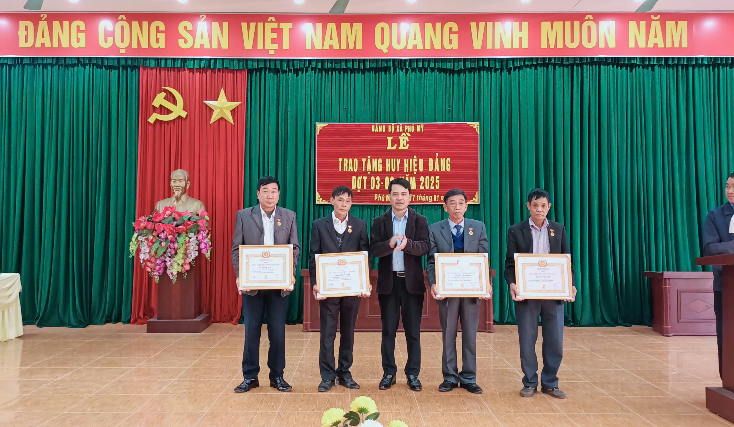 Tại xã Phú Mỹ, chiều ngày 17/01/2025, Đảng bộ xã Phú Mỹ đã long trọng tổ chức lễ trao tặng huy hiệu Đảng 50 năm, 45 năm và 30 năm tuổi đảng cho 04 đồng chí đảng viên đợt 03/02/2025. Tới dự và trao tặng huy hiệu Đảng cho các đồng chí đảng viên có đồng chí Ngô Quang Chính - Ủy viên BTV Huyện ủy – Phó Chủ tịch HĐND Huyện. Về phía địa phương có các đồng chí trong BTV Đảng ủy, các đồng chí trong BCH Đảng ủy, các đồng chí bí thư chi bộ.