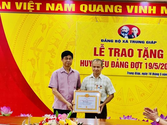 Tại Đảng bộ xã Trung Giáp, đồng chí Nguyễn Long Giang- UVBTV Huyện ủy, PCT UBND huyện đã trao HHĐ 55 năm tuổi Đảng cho đồng chí Hoàng Đình Phúc; 45 năm tuổi Đảng cho đồng chí Lê Văn Phú và 40 năm tuổi Đảng cho đồng chí Nguyễn Xuân Lập