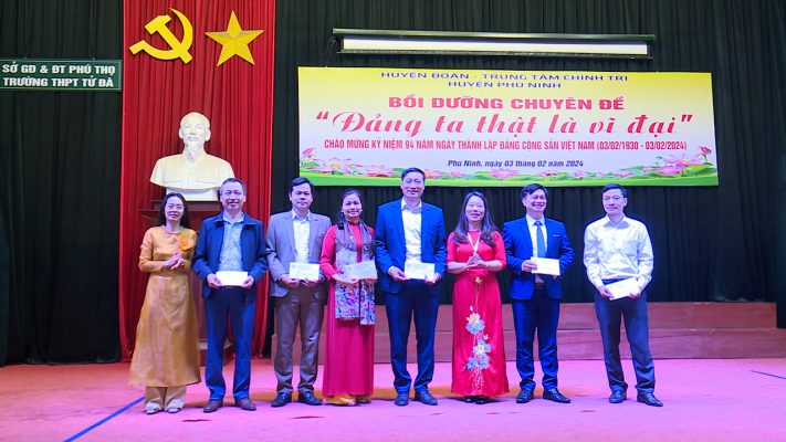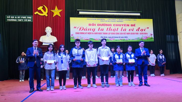 (Phù Ninh)- Chào mừng kỷ niệm 94 năm ngày Thành lập Đảng cộng sản Việt Nam (03/02/1930- 03/02/2024). Sáng 03/2/2024, tại Trường THPT Tử Đà, Ban Thường vụ Huyện Đoàn Phù Ninh phối hợp với Trung tâm Chính trị huyện tổ chức Chương trình ngoại khóa Bồi dưỡng chuyên đề “Đảng ta thật vĩ đại”. Tới dự có đồng chí Nguyễn Thị Hoa Mỹ- Trưởng khoa Xây dựng Đảng- Trường Chính trị tỉnh Phú Thọ. Về phía huyện Phù Ninh có đồng chí Nguyễn Minh Quân – UV BTV Huyện ủy – Trưởng Ban dân vân Huyện ủy, các đồng chí lãnh đạo Ban Tuyên giáo, Trung tâm Chính trị, Huyện Đoàn Phù Ninh; các đồng chí trong Ban Giám hiệu, các thầy giáo, cô giáo và trên 800 em học sinh của nhà trường.