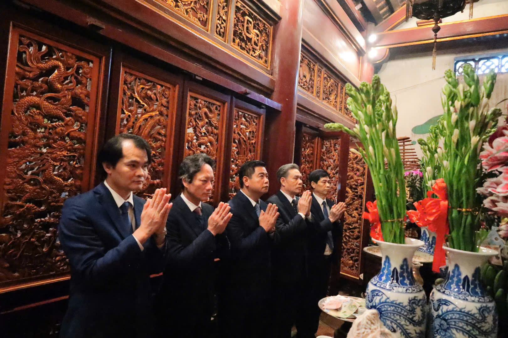 Sau khi dâng hương tưởng niệm các Vua Hùng tại điện Kính Thiên, đoàn đại biểu huyện Phù Ninh dâng hương tại Đền Quốc Tổ Lạc Long Quân và dâng hoa tưởng niệm tại bức phù điêu Bác Hồ nói chuyện với cán bộ, chiến sỹ Đại đoàn quân Tiên Phong tại ngã năm đền Giếng.