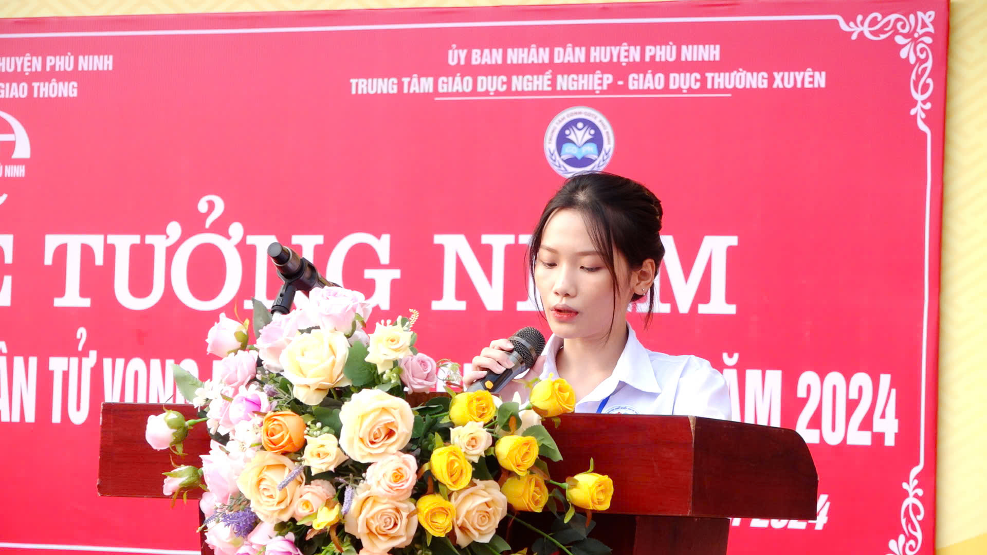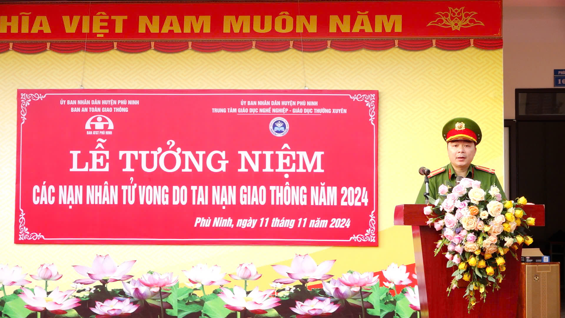 (Phù Ninh)- Ngày 11/11/2024, Ban an toàn giao thông ( ATGT) huyện Phù Ninh phối hợp với Trung tâm Giáo dục Nghề nghiệp - Giáo dục Thường xuyên huyện Phù Ninh tổ chức lễ tưởng niệm các nạn nhân tử vong do tai nạn giao thông năm 2024. Dự chương trình có đại diện Ban ATGT tỉnh Phú Thọ; đồng chí Nguyễn Long Giang – Uỷ viên Ban Thường vụ Huyện uỷ, Phó Chủ tịch UBND huyện; đồng chí Nguyễn Minh Quân – Uỷ viên Ban Thường vụ Huyện uỷ, Trưởng Ban Dân vận Huyện uỷ; đại biểu các ban, ngành, đoàn thể, cơ quan, đơn vị chuyên môn của huyện, các đồng chí trưởng Ban ATGT các xã, thị trấn; các thầy cô giáo và toàn thể các em học viên Trung tâm Giáo dục Nghề nghiệp - Giáo dục Thường xuyên huyện.