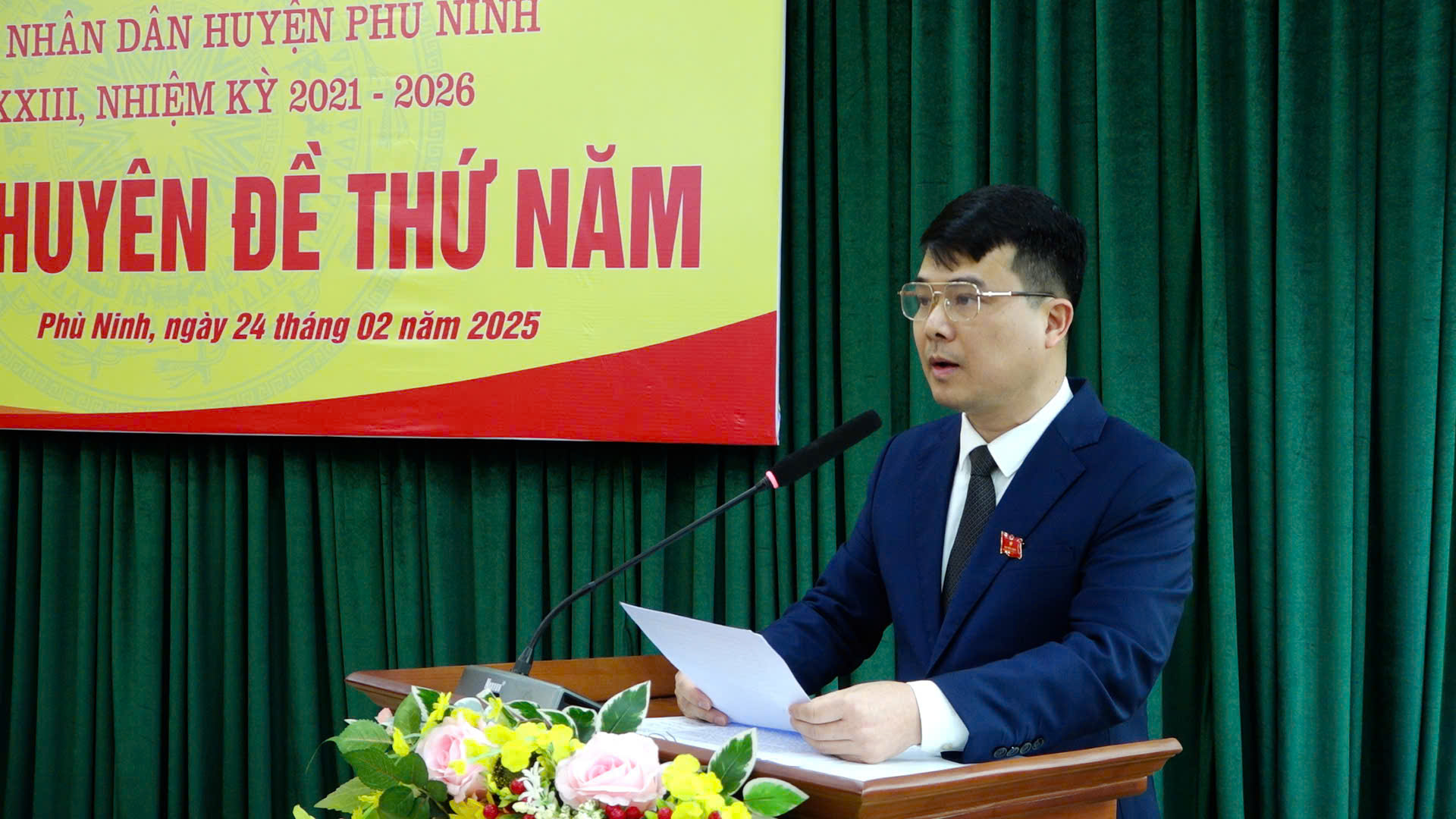 (Phù Ninh)- Chiều ngày 24/2/2025, HĐND huyện Phù Ninh khóa XXIII, nhiệm kỳ 2021 - 2026 tổ chức Kỳ họp chuyên đề thứ Năm thông qua dự thảo Nghị quyết về việc thành lập, tổ chức lại một số cơ quan chuyên môn thuộc UBND huyện. Đồng chí Ngô Quang Chính - Ủy viên BTV Huyện ủy, Phó Chủ tịch HĐND huyện chủ toạ kỳ họp. Dự kỳ họp có đồng chí Nguyễn Hữu Nhật – Phó Bí thư Huyện ủy, Chủ tịch UBND huyện, đồng chí Nguyễn Quang Vinh – Phó Bí thư Thường trực Huyện ủy, các đồng chí Ủy viên BTV Huyện ủy; lãnh đạo các phòng, ban, đơn vị cùng các vị đại biểu HĐND huyện.