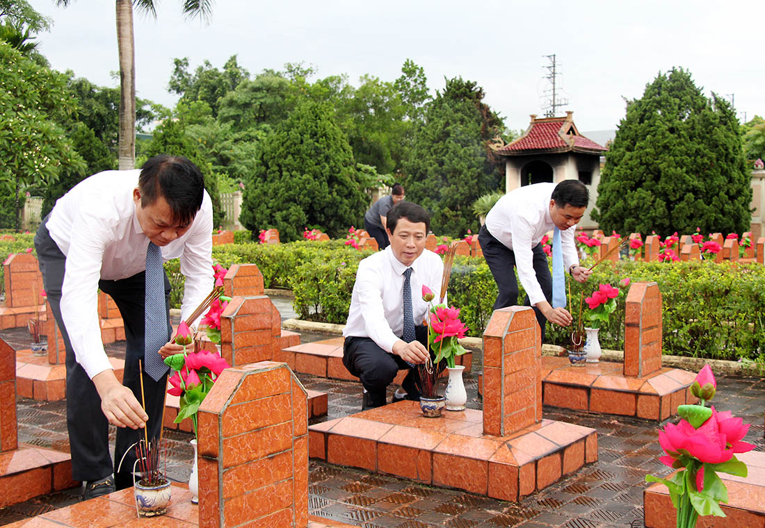 Phó Chủ tịch UBND tỉnh Phan Trọng Tấn và các đại biểu thắp hương tại các phần mộ liệt sĩ tại Nghĩa trang Liệt sĩ huyện Đoan Hùng