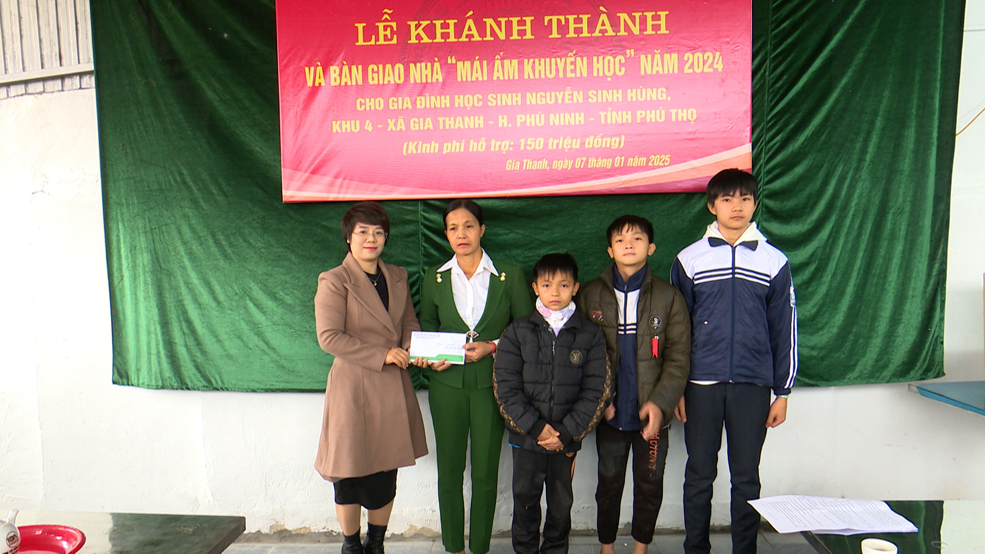 Em Nguyễn Sinh Hùng là học sinh lớp 6, Trường THCS Tiên Du, nhà ở khu 4, xã Gia Thanh. Gia đình em có hoàn cảnh hết sức đặc biệt, Bố bỏ đi từ khi em còn nhỏ, mẹ làm nghề nông, sức khỏe yếu, 3 anh em đang học THCS, gia đình em thuộc hộ nghèo, có hoàn cảnh đặc biệt khó khăn, em và gia đình ở trong ngôi nhà đã xuống cấp của bà Ngoại cho. Cảm thông trước hoàn cảnh của gia đình em, được sự quan tâm của Hội Khuyến học tỉnh Phú Thọ, Hội Khuyến học huyện Phù Ninh, Công ty TNHH JNTC ViNa, cấp ủy chính quyền, các ban, ngành, đoàn thể của xã cùng gia đình, dòng họ… đã xây dựng cho gia đình em căn nhà cấp 4, gồm 4 phòng ngủ và 1 phòng khách, mái lợp tôn xốp, đóng trần, nền lát gạch men có diện tích sử dụng 80m2. Với tổng kinh phí xây dựng là trên 317 triệu đồng, trong đó Hội Khuyến học tỉnh Phú Thọ kết nối với Công ty TNHH JNTC ViNa hỗ trợ 150 triệu đồng. Số còn lại vận động sự giúp đỡ của anh em, dòng họ và bà con Nhân dân trong khu dân cư…Công trình khởi công ngày 14/9/2024. Sau hơn 3 tháng thi công, đến nay ngôi nhà đã hoàn thành đáp ứng mong mỏi bấy lâu của em và gia đình. Tại buổi bàn giao nhà thay mặt lãnh đạo Công ty TNHH JNTC ViNa đã trao 150 triệu đồng cho gia đình em.