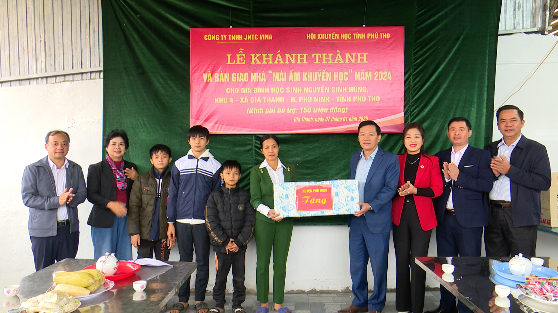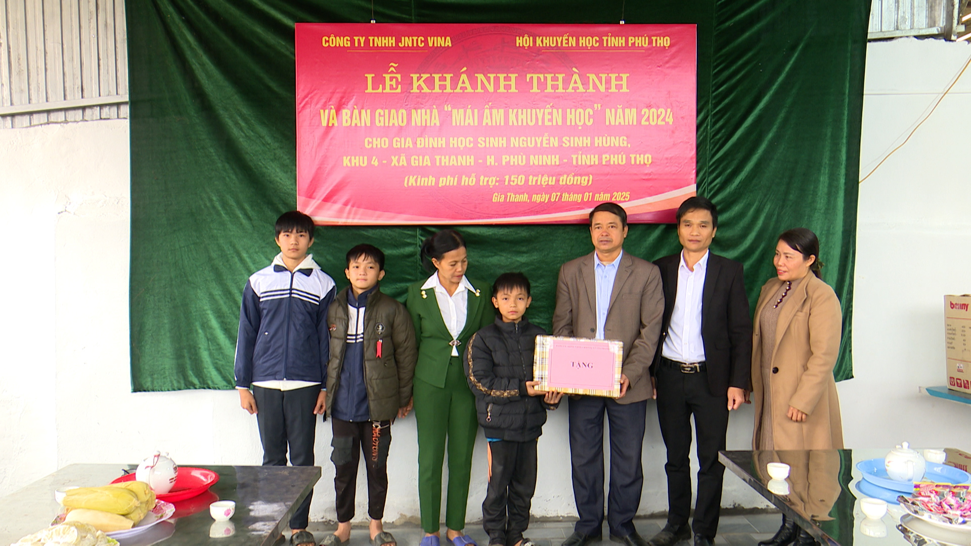 (Phù Ninh)- Ngày 07/01, tại xã Gia Thanh, Hội Khuyến học tỉnh Phú Thọ phối hợp với Hội Khuyến học huyện Phù Ninh, Công ty TNHH JNTC ViNa tổ chức Khánh thành và bàn giao nhà “Mái ấm khuyến học” cho gia đình em Nguyễn Sinh Hùng, học sinh lớp 6 Trường THCS Tiên Du. Dự chương trình có bà Phạm Thị Hường - Chủ tịch Hội Khuyến học tỉnh, các đồng chí lãnh đạo Hội Khuyến học tỉnh. Về phía huyện Phù Ninh có đồng chí Trịnh Đức Lai - UV BTV Huyện ủy, Phó Chủ tịch UBND huyện, các đồng chí đại diện lãnh đạo Phòng Giáo dục & Đào tạo, Hội Khuyến học, Phòng Lao động –Thương binh & xã hội, Văn phòng HĐND & UBND, Hội Chữ thập đỏ huyện; các đồng chí lãnh đạo Đảng ủy, HĐND, UBND, UB MTTQ, các tổ chức chính trị - xã hội xã Gia Thanh, các đồng chí lãnh đạo Trường THCS xã Tiên Du và bà con Nhân dân khu khu 4, xã Gia Thanh.