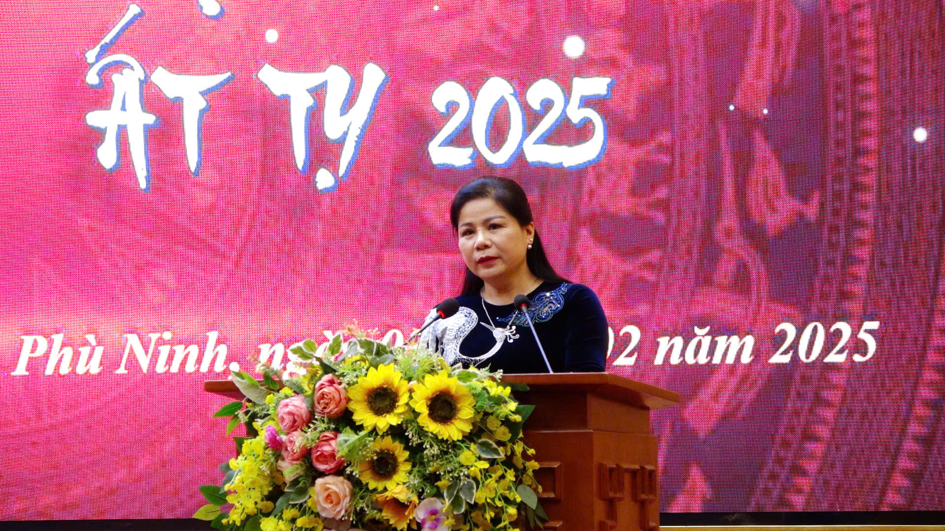 Thay mặt các đồng chí lãnh đạo huyện, đồng chí Nguyễn Thị Tố Uyên - TUV, Bí thư Huyện uỷ, Chủ tịch HĐND huyện đã gửi lời chúc tết tốt đẹp nhất tới toàn thể cán bộ, công chức, viên chức, người lao động cơ quan Đảng – Đoàn thể và cơ quan khối Chính quyền huyện đón một năm mới an khang, thịnh vượng. Đồng chí Bí thư Huyện uỷ tin tưởng đội ngũ cán bộ, công chức, viên chức, người lao động của huyện trong năm 2025 với tinh thần đoàn kết, nhất trí, năng động, sáng tạo sẽ bắt tay ngay vào công việc, giành kết quả to lớn hơn, tạo đà thực hiện thắng lợi các chỉ tiêu, nhiệm vụ của kế hoạch năm 2025. Đồng thời, mong muốn trong năm 2025 là năm có ý nghĩa hết sức quan trọng các Ban xây dựng Đảng, cơ quan, đơn vị, các phòng chuyên môn cần thực hiện tốt các mục tiêu, nhiệm vụ đã đề ra, trước mắt tập trung vào nhiệm vụ chỉ đạo tổ chức thành công Đại hội Đảng cấp cơ sở nhiệm kỳ 2025 -2030; công tác sản xuất lúa vụ chiêm xuân, công tác tuyển chọn và gọi công dân nhập ngũ năm 2025 và một số nhiệm vụ khác góp phần xây dựng huyện Phù Ninh sớm trở thành huyện Nông thôn mới.