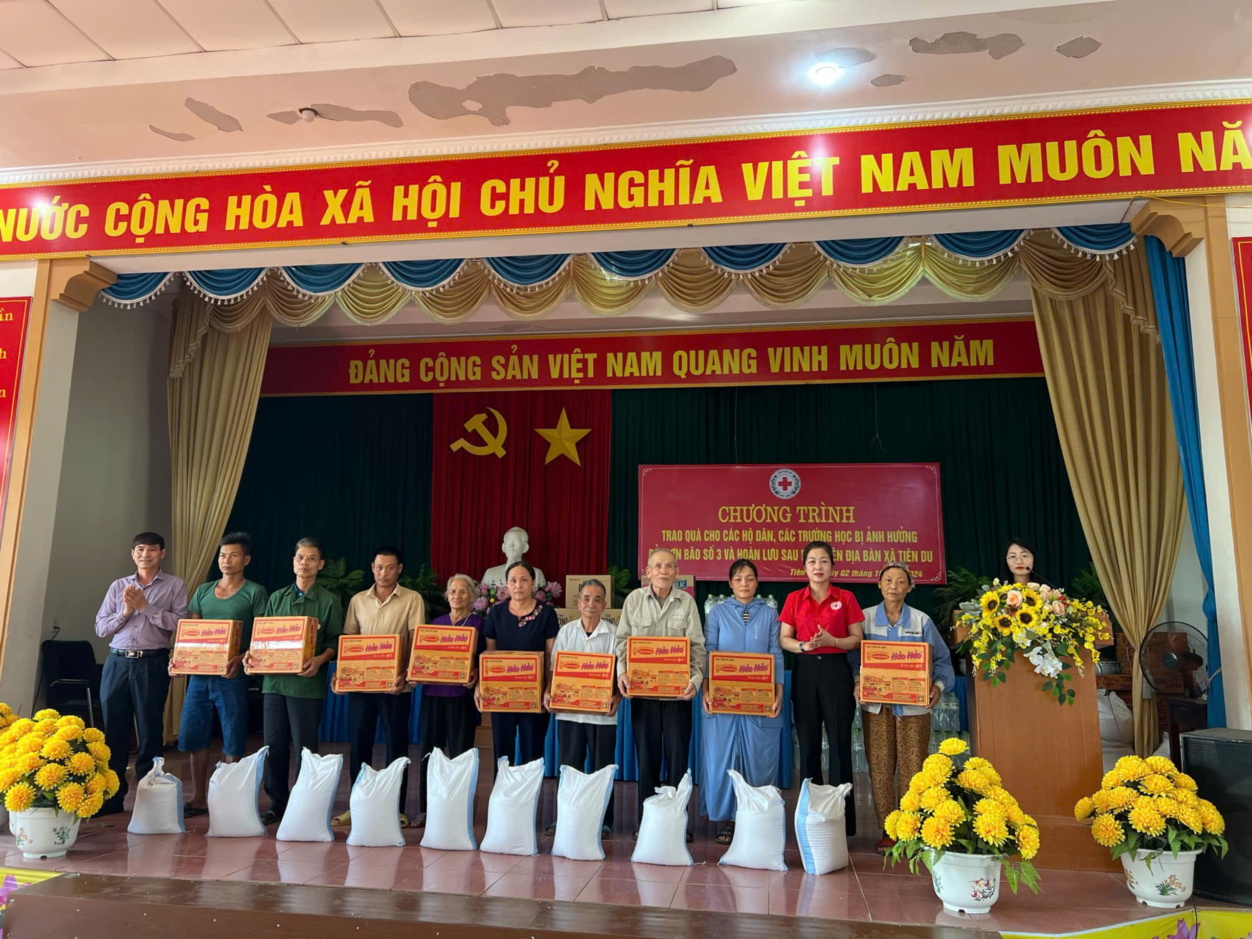 Các đồng chí lãnh đạo Hội Chữ Thập đỏ, lãnh đạo xã Tiên Du trao hỗ trợ cho các gia đình bị ảnh hưởng bão số 3 tại xã Tiên Du.