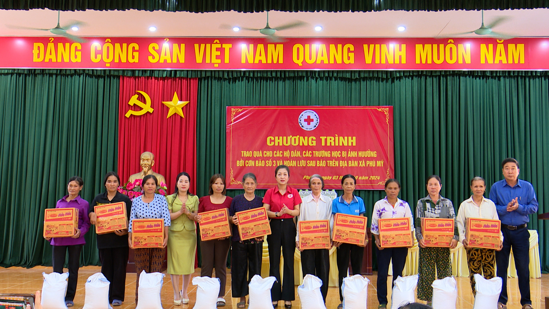 Các đồng chí lãnh đạo Hội Chữ Thập đỏ, lãnh đạo xã Phú Mỹ trao hỗ trợ cho các hộ gia đình bị ảnh hưởng bởi bão số 3 tại xã Phú Mỹ.